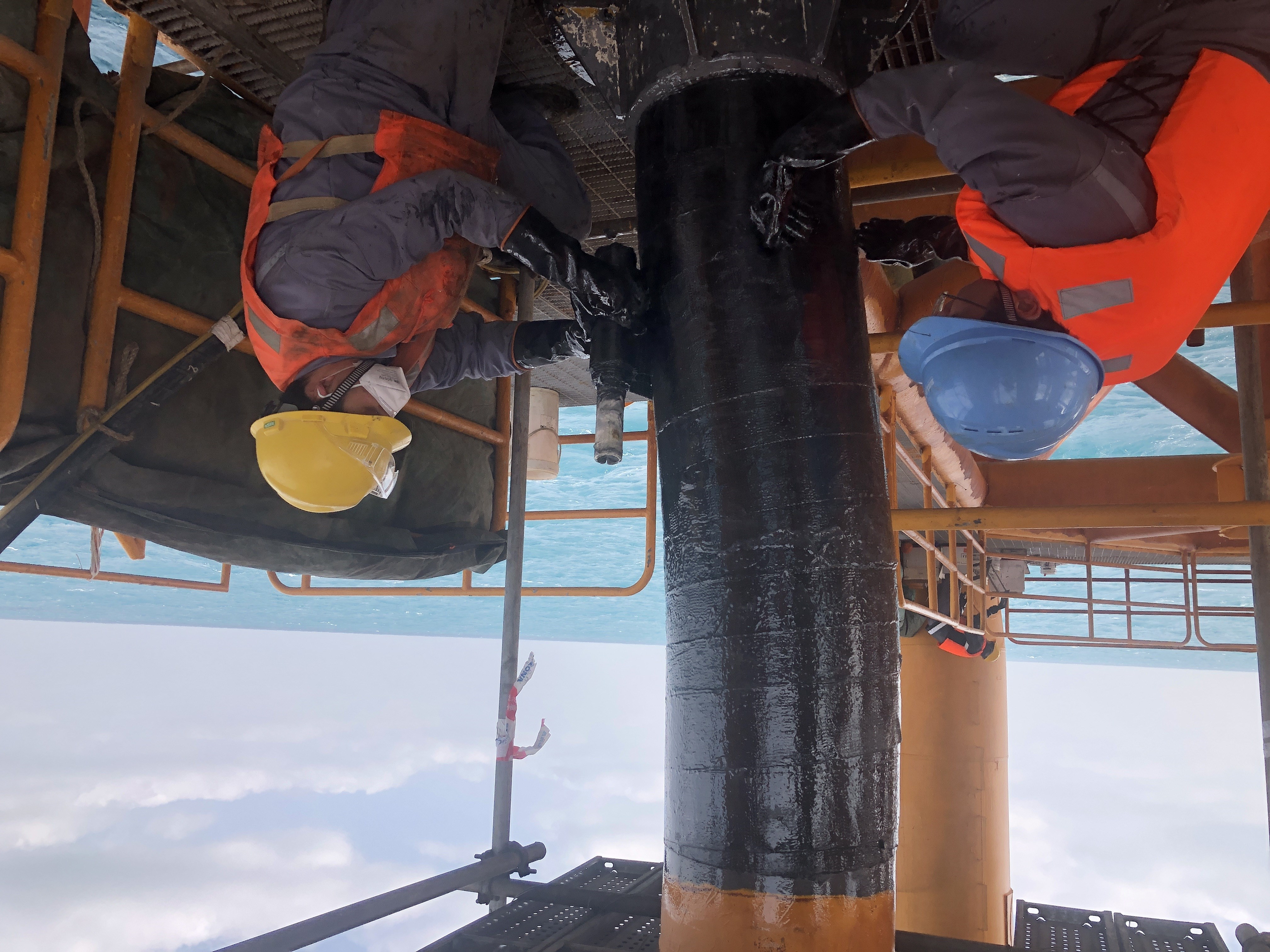 1.喷砂后的管道缺陷; 2.Belzona管道包扎施工进行中 3.Belzona管道包扎施工完成 4.采用Belzona耐紫外线涂层整体保护。