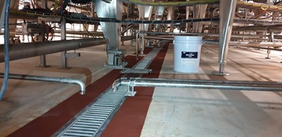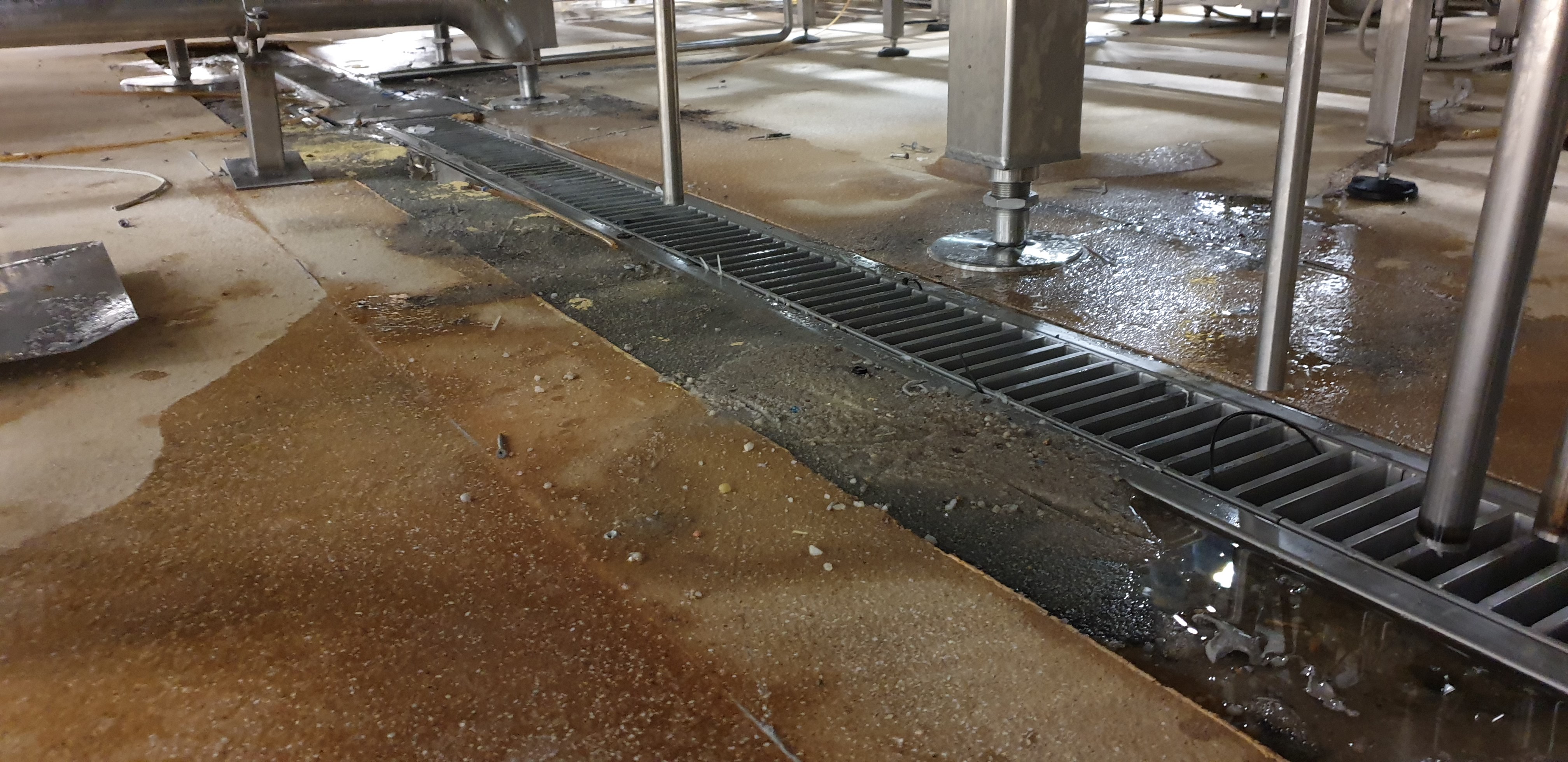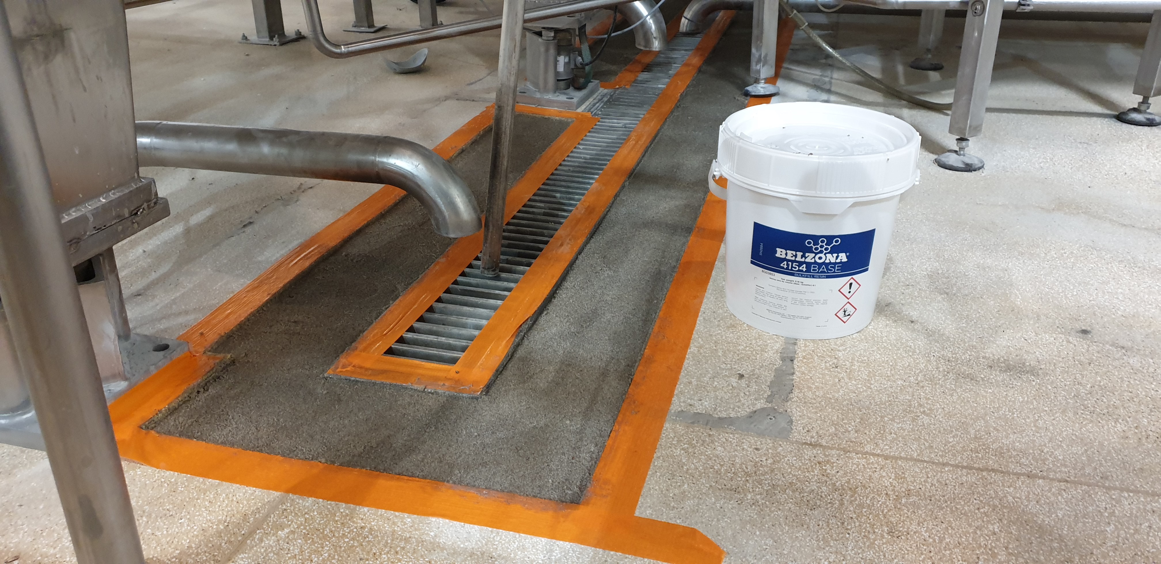 Problem: 客户此前曾使用传统修复方法进行过两次修复尝试。在之前的修复过程中,密封条覆盖了一层耐化学腐蚀的薄板。该解决方案已通过高温和腐蚀性介质的验证。生产过程中频繁且强烈的清洗导致薄板脱落,导致混凝土表面与金属排水口之间泄漏增加,进而导致薄板下方及排水管线沿线的基材进一步劣化。反复采用传统修复方法并配合金属薄板覆盖的修复措施被证明无效。