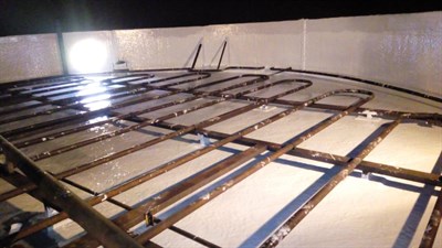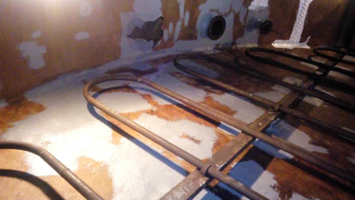 Problem: 工作温度为 70°C 的油罐,由于水和碳氢化合物的分离,罐体底部出现内部腐蚀。玻璃钢油罐底部加热管下方的区域也开始脱层。