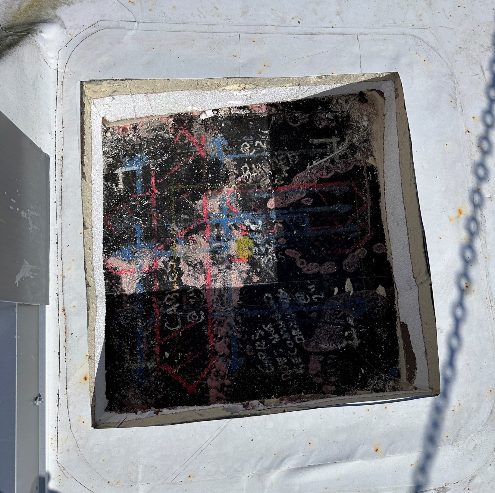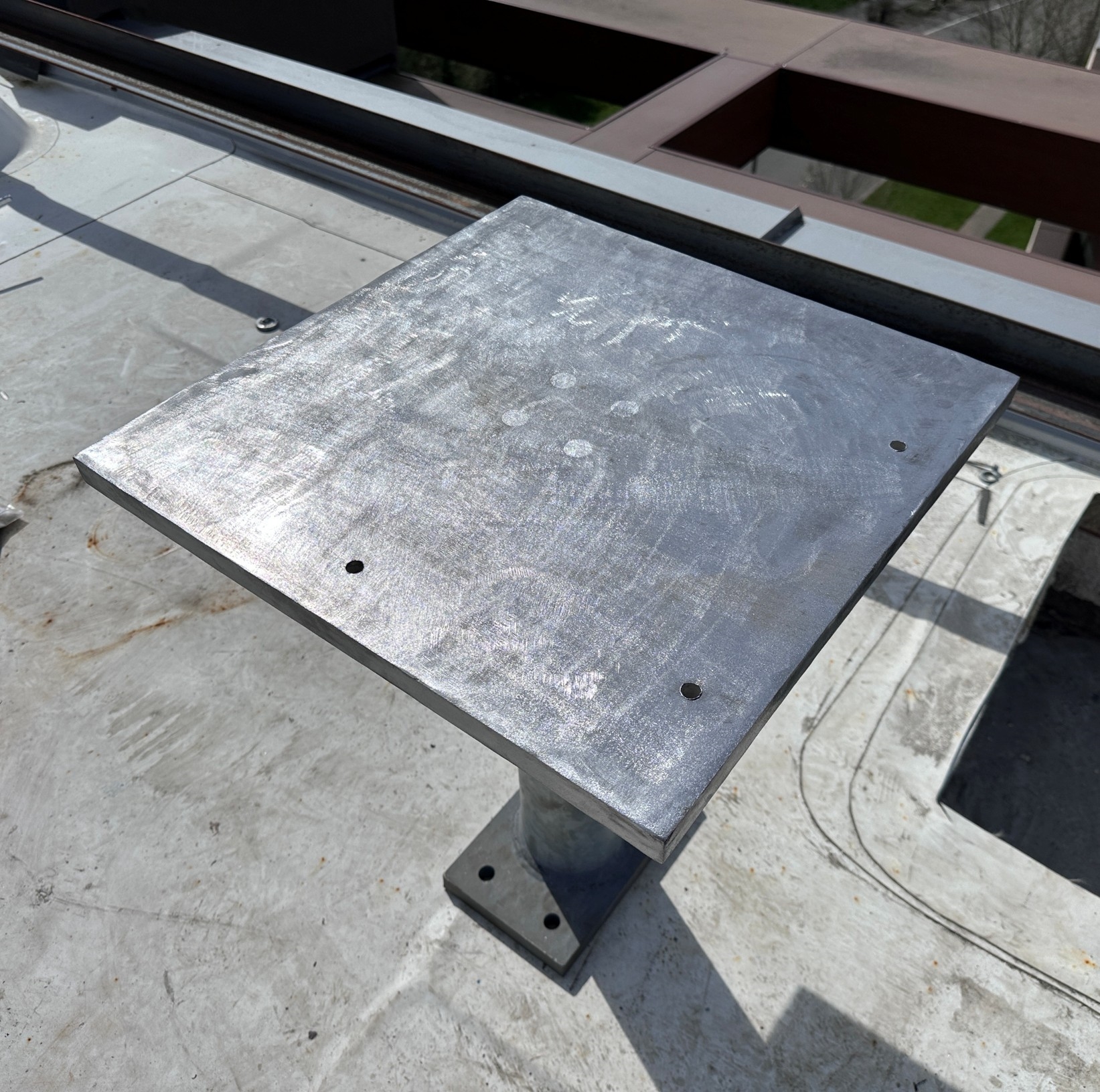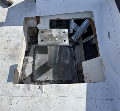The application was carried out April 2026 under clear, sunny conditions at approximately 70°F, well within the recommended temperature window for the Belzona 4000 series product line. Each concrete bonding footprint was mechanically prepared using a needle gun and scabbler to remove surface laitance, expose clean aggregate, and establish an open, profiled surface suitable for adhesion. The carbon steel leg plates were prepared to SSPC-SP 11 (Power Tool Cleaning to Bare Metal) to provide a clean, roughened bonding surface free of contaminants. Belzona 4911 (Magma TX Conditioner) was then applied to both the prepared concrete and the prepared steel as a bonding primer to penetrate the substrates and maximize adhesion of the paste grade material. Belzona 4111 (Magma-Quartz) was mixed and trowel applied to form the structural bond line between each leg plate and the roof slab, with the plates bedded and aligned into the wet paste to achieve full contact. All work was performed in accordance with Belzona's Instructions for Use (IFU's). Total hands-on application time for all five leg plates was approximately four hours, and the assembly was left undisturbed for a two-day cure before the steel platform was loaded.