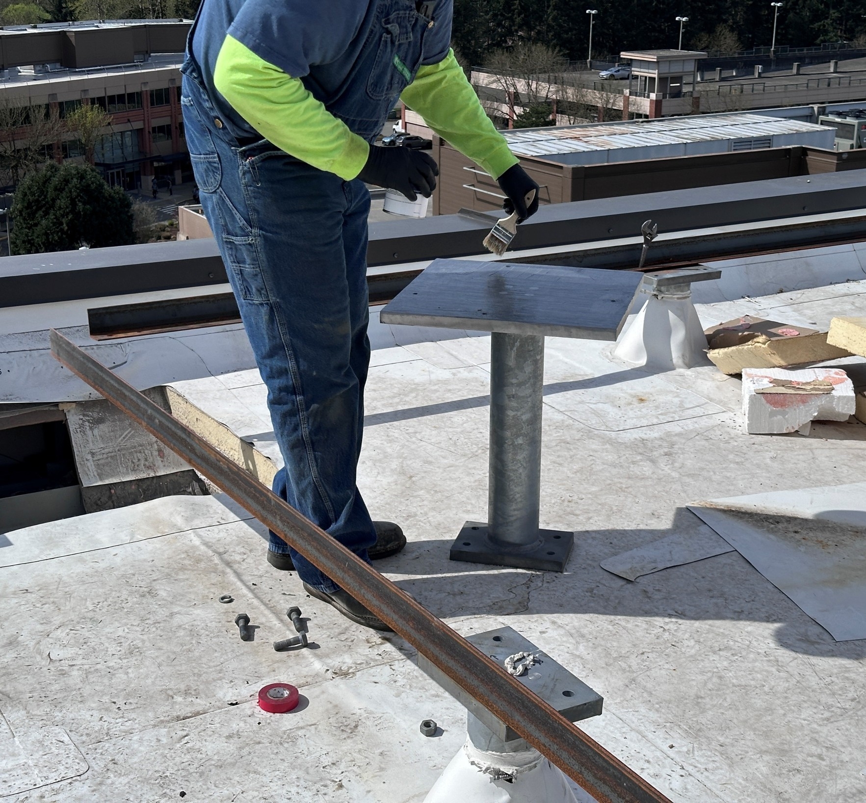 Belzona Technology Northwest worked directly with the installing contractor to engineer a cold bond solution that would secure five carbon steel leg plates to the concrete roof deck. Because the hotel remained fully occupied throughout the project, hot work, welding, and high-noise percussive tooling were not viable options, and any disruption to hotel guests had to be minimized. Traditional mechanical anchoring had already been ruled out by the scan findings, and a full structural redesign of the platform would have delayed the network activation schedule, required additional engineering review, and significantly increased the overall project cost. Cold bonding with Belzona 4111 (Magma-Quartz) and Belzona 4911 (Magma TX Conditioner) offered a permanent, load-bearing attachment that preserved the integrity of the slab, kept the contractor on the original platform footprint, and allowed the work to proceed without impacting building operations.