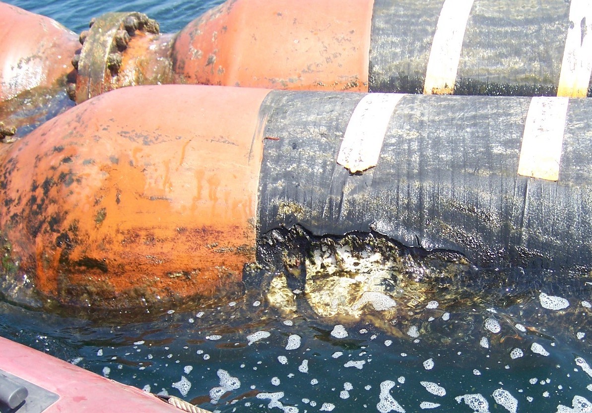 Problem: 燃料の積み降ろしの際、船舶のプロペラによるホース浮力材及び絶縁材のゴム製被覆材の損傷
