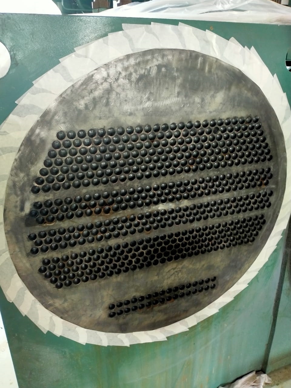 The application was carried out in accordance with Belzona Know-How System Leaflets HEX-1 and HEX-2, ensuring compliance with industry best practices for corrosion protection and equipment longevity. The surface was grit blasted and thoroughly cleaned. Plastic/rubber plugs were inserted during surface preparation to prevent media from entering the tubes. These plugs were then removed and reapplied before the product application. Belzona 1121 (Super XL-Metal) was used to rebuild and resurface the worn areas, while Belzona 5821 was applied as a two-coat system to protect the tube sheet and end cover from corrosion and erosion.