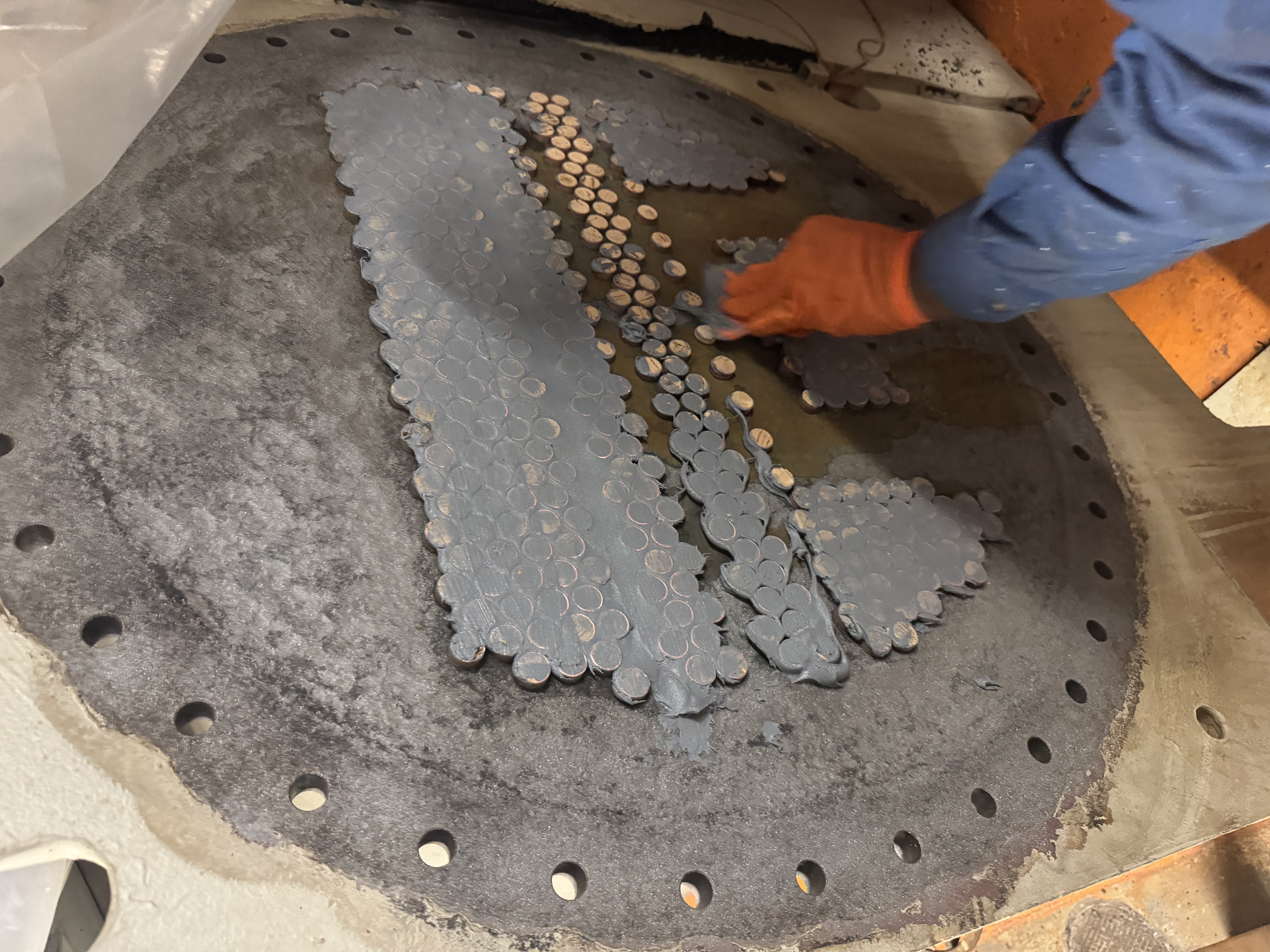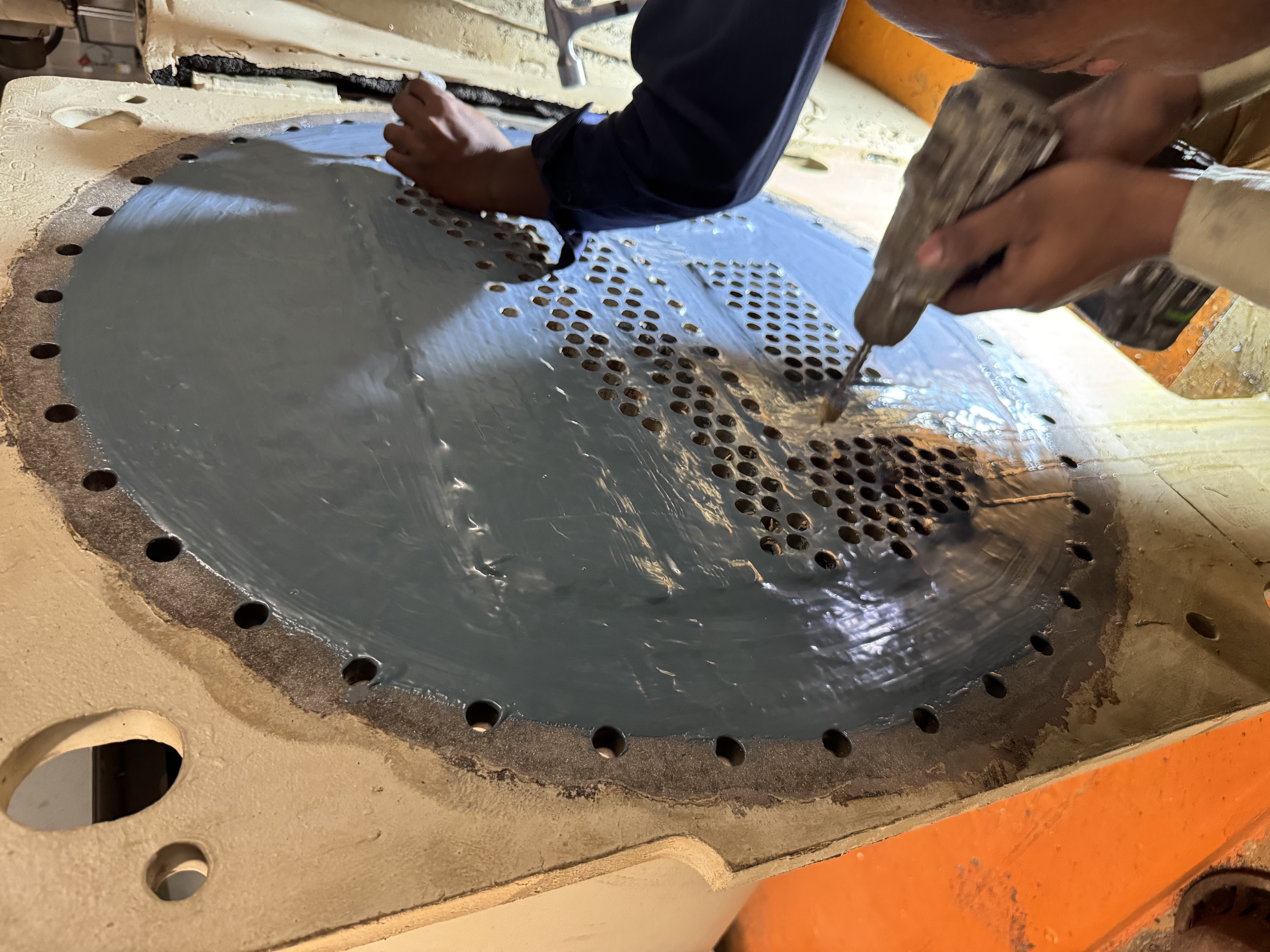 We sponge blasted the steel sheet and end cap to achieve the required white metal profile. We proceeded to place corks in the tubes. Belzona 1111 was applied to the low areas on the sheet to recreate the surface needed for coatings. Two coats of Belzona 1321 were applied to the tube sheet and end cap. Air was used to blow out the corks on the other side.