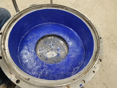 The pump was blasted and cleaned. After cleaning it was rebuilt with Belzona 1818. First coat of Belzona 1321 was applied and shortly after that second coat of Belzona 1321.