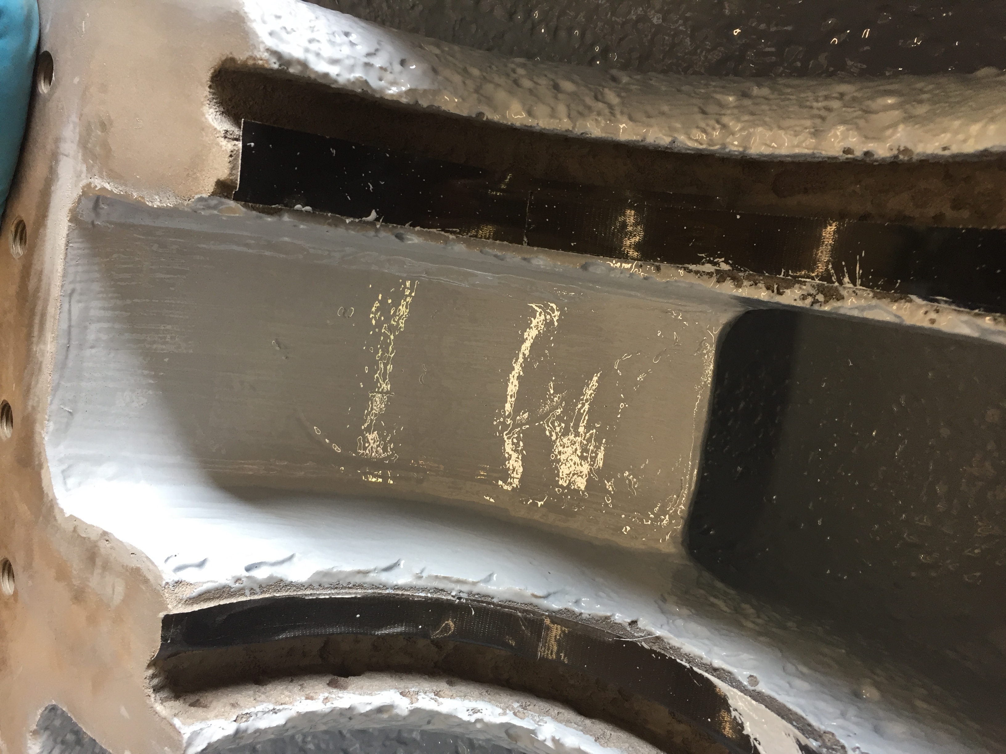 Picture shows completed application of Belzona 1341 (Supermetalglide) on the top half of the casing.