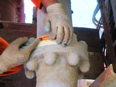 5. Apply Belzona 8411 to the flange and pipe area. Allow it to become touch dry. Belzona 8411 is required for the encapsulating membrane system in order to achieve the optimum level of corrosion protection and to allow access to bolts and flanges in the event of required maintenance.