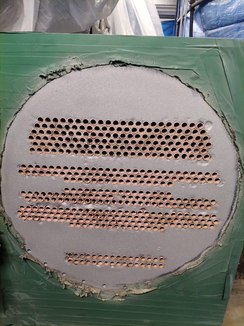 Welding the tubesheet would be extremely costly and time-consuming due to the need for dismantling, making it an impractical option. Additionally, welding could compromise the integrity of the pipes and lead to further corrosion issues. Instead, we offered a cost-effective, cold-applied solution as an alternative to welding. This solution requires no dismantling and can be completed on-site in just 4 days.