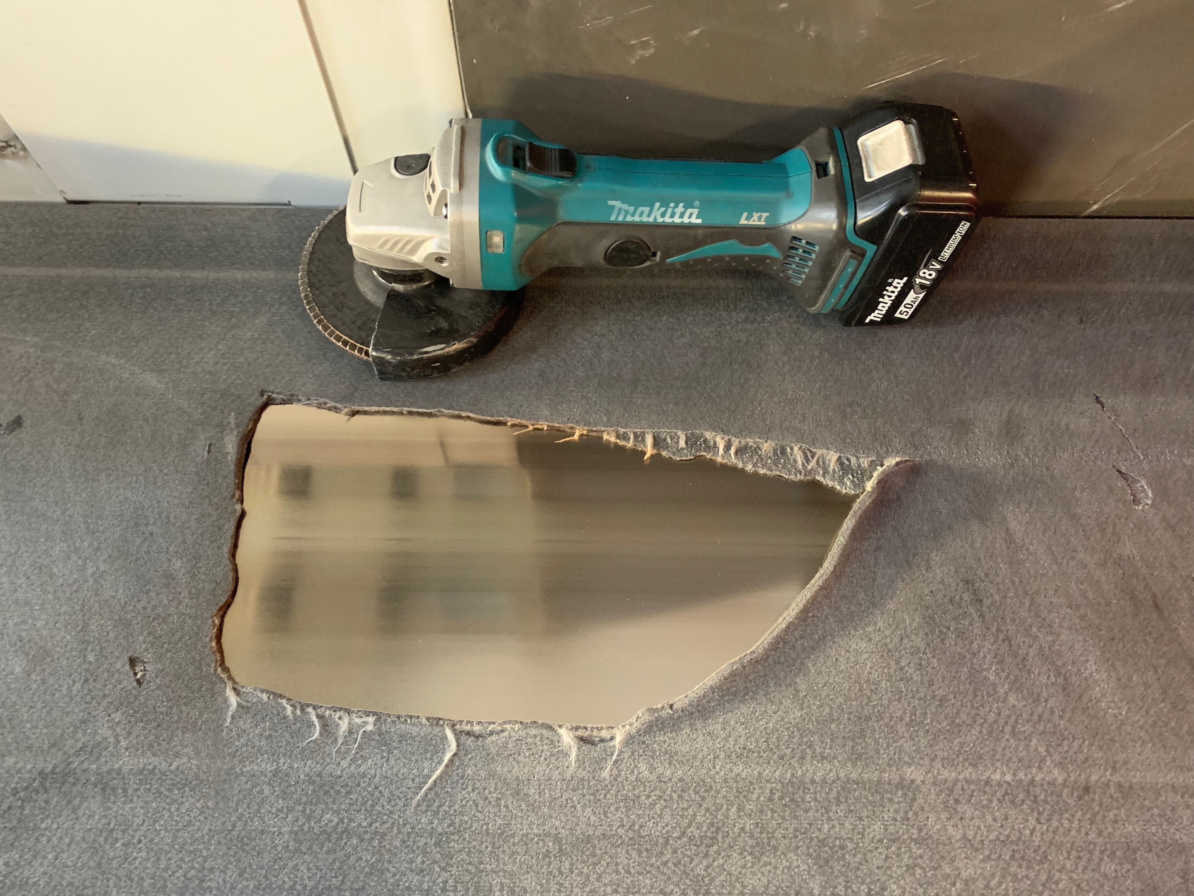 1. Situation du réparation (Outil électrique dans la photo pour montrer l’échelle) 2. Patch de la bande de réserve découpé 3. Zone masquée et réparation en course d’achèvement en utilisant Belzona 2311. 4.Réparation complétée en environ 40 minutes.