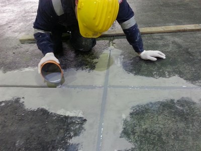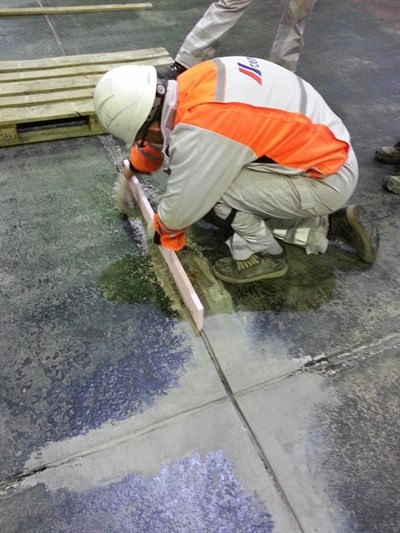 Concrete floor of a warehouse in a cement plant was damaged due to heavy traffic of forklifts and trucks, as well as storage of palettes with cement over time. The damage was situated on joint areas of large concrete plates (3m x 5m) of the floor.