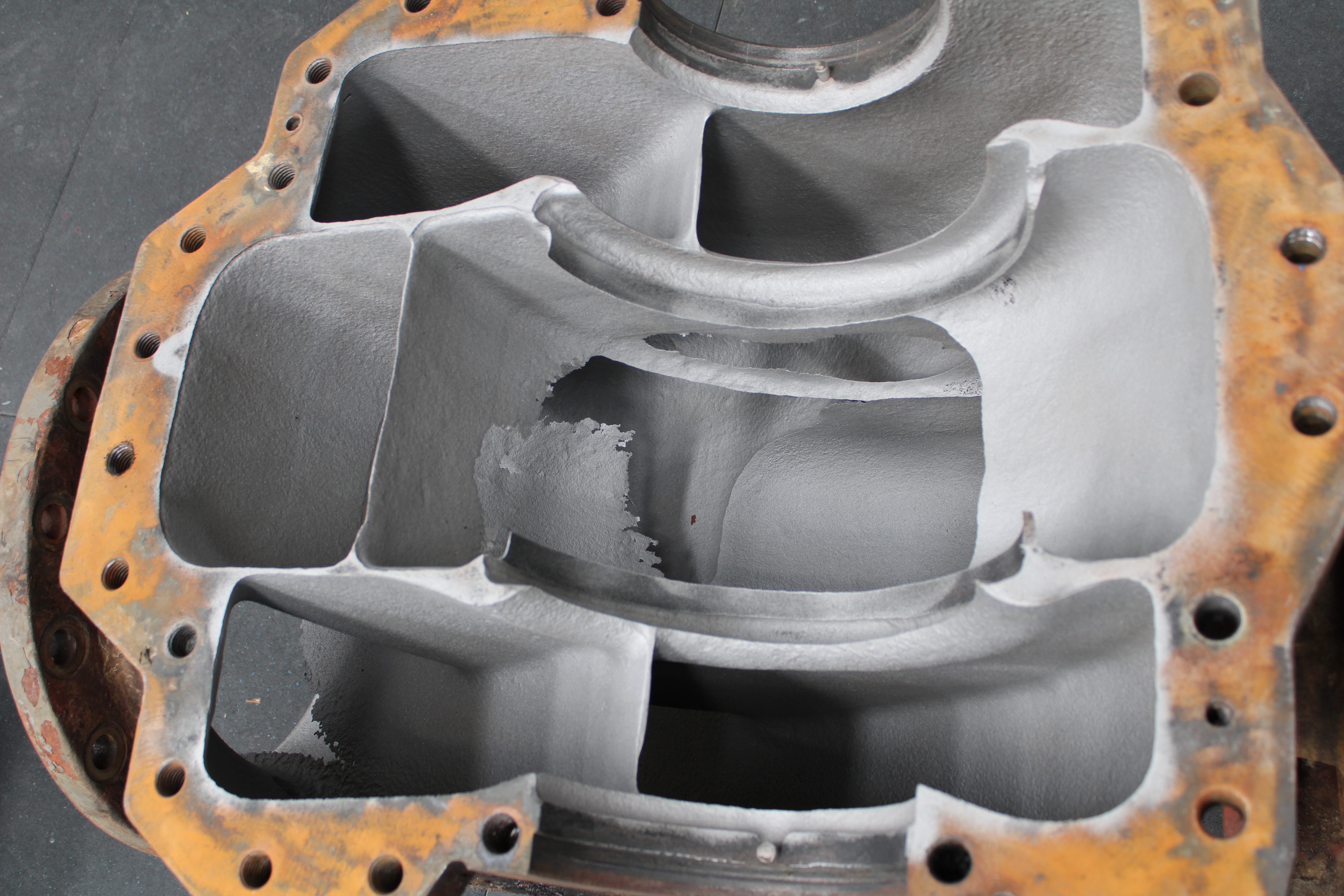 The pump was grit-blasted, back to minimum surface profile. The through wall defects and eroded edges of the pump were rebuilt using Belzona 9371. Then a a two-coat system of Belzona 1391T was applied to protect against erosion/corrosion until new pump could be installed.