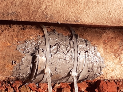 As a best effort, the pipe was repaired with an oversized pre-made shell, Belzona 1212 and tie wraps