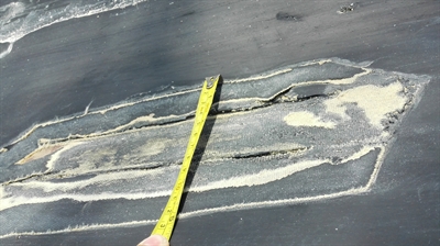 Problem: La banda de transporte, con alma de 3 lonas y un grosor aproximado de 1 cm, presentaba dos rajaduras pasantes de 24 cm aproximadamente debido a la operación con material abrasivo, tierra y piedra.