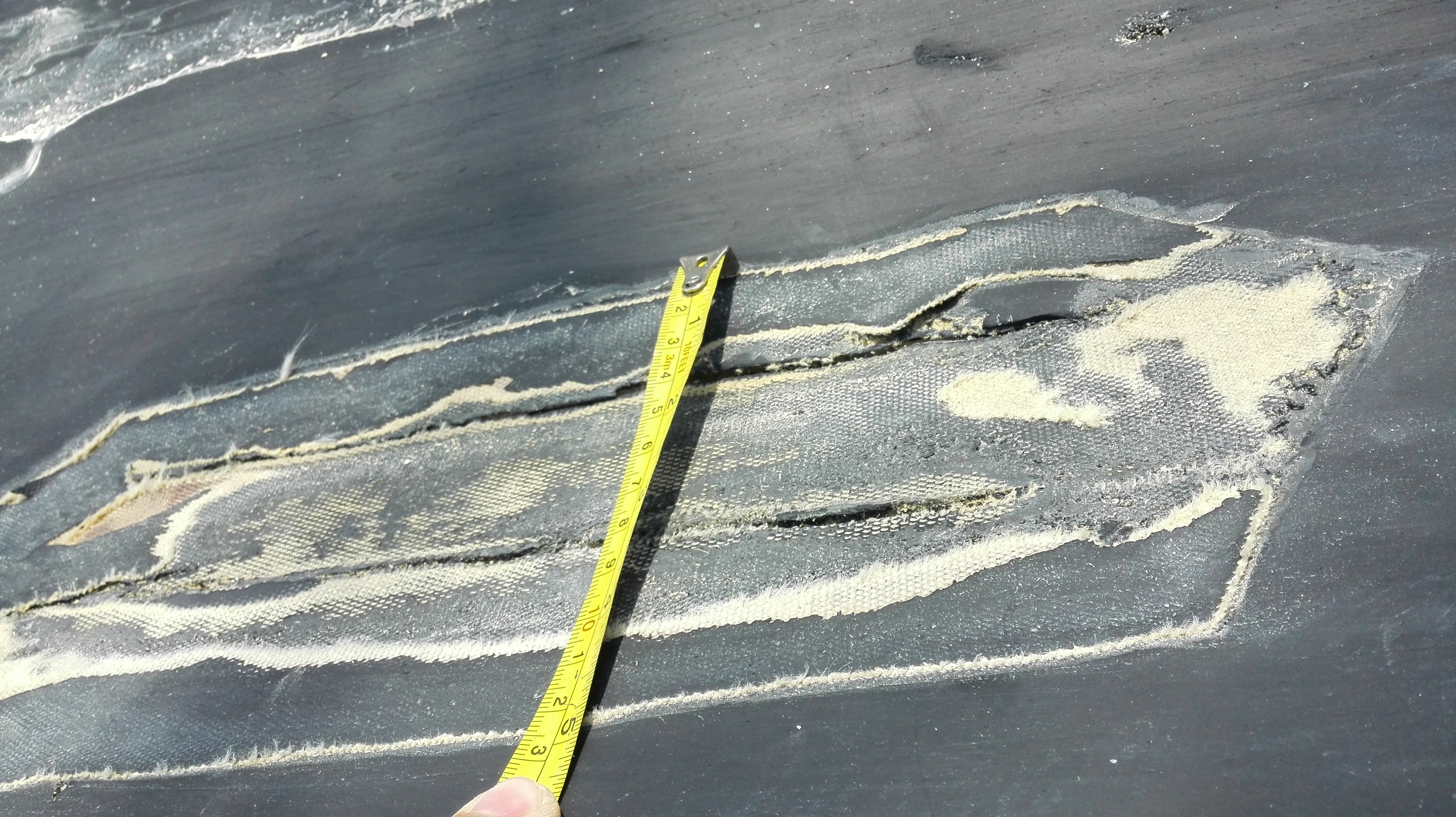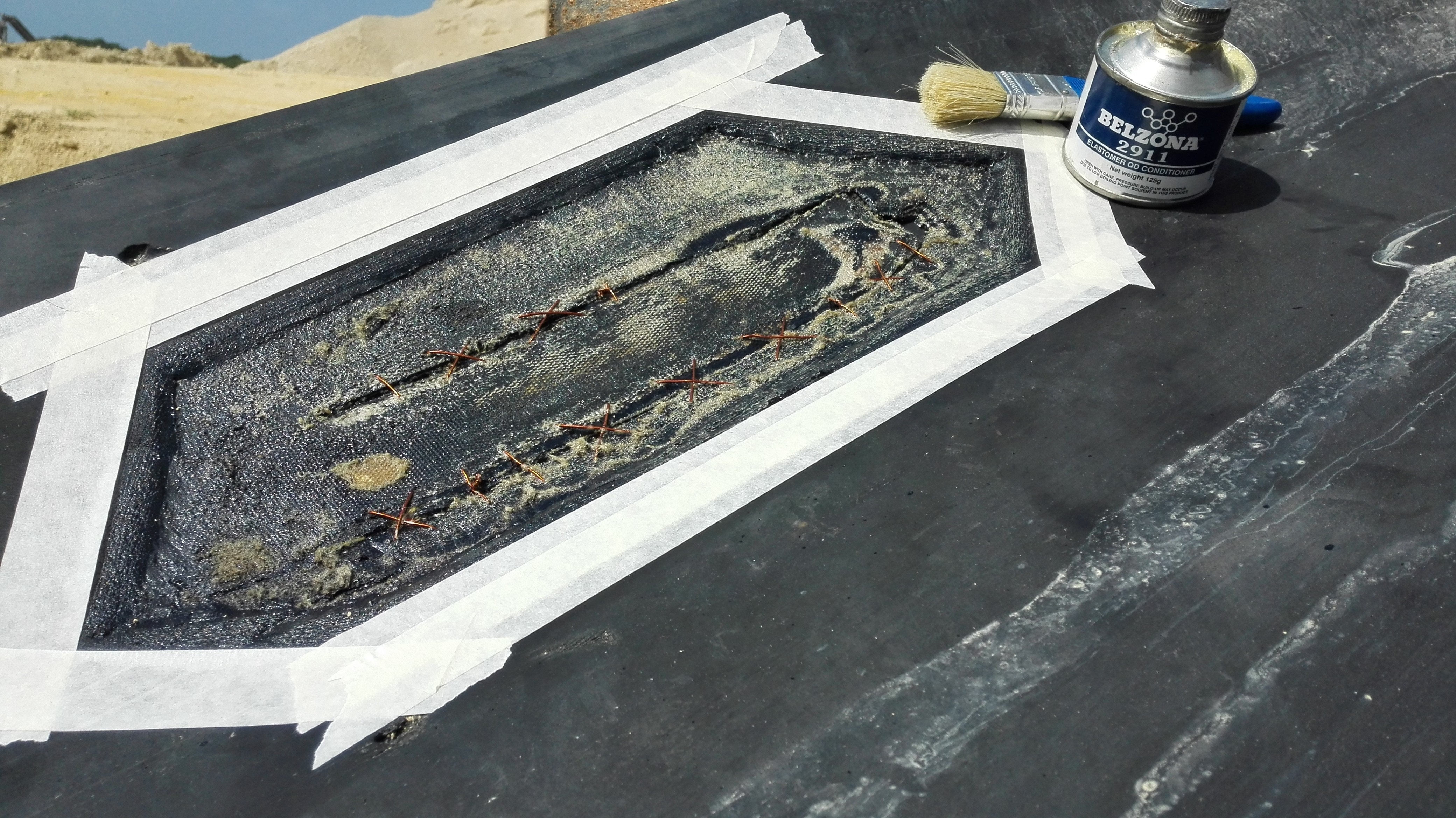 Primero, se rebajó una lámina de la superficie para obtener un sustrato limpio y dejar el área de reparación con bajo relieve y profundidad adecuada para la aplicación. Luego, se aplicó Belzona 2911 (Elastomer QD Conditioner) para garantizar una excelente adherencia entre los materiales. A continuación, se prepararon tramos de cinta de refuerzo Belzona 9341 (Reinforcement Tape) y se mezcló Belzona 2311 (SR Elastomer), aplicando la primera capa sobre la banda. La cinta de refuerzo se humedeció antes de posicionarla, y finalmente se aplicó Belzona 2311 para rellenar toda la zona y asegurar un acabado uniforme.
