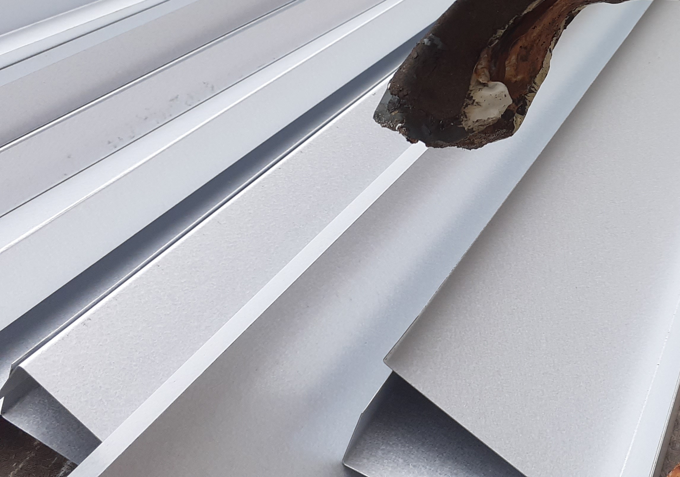 Gutter above concourse, showing corrosion, failed joints and dropped edges.
