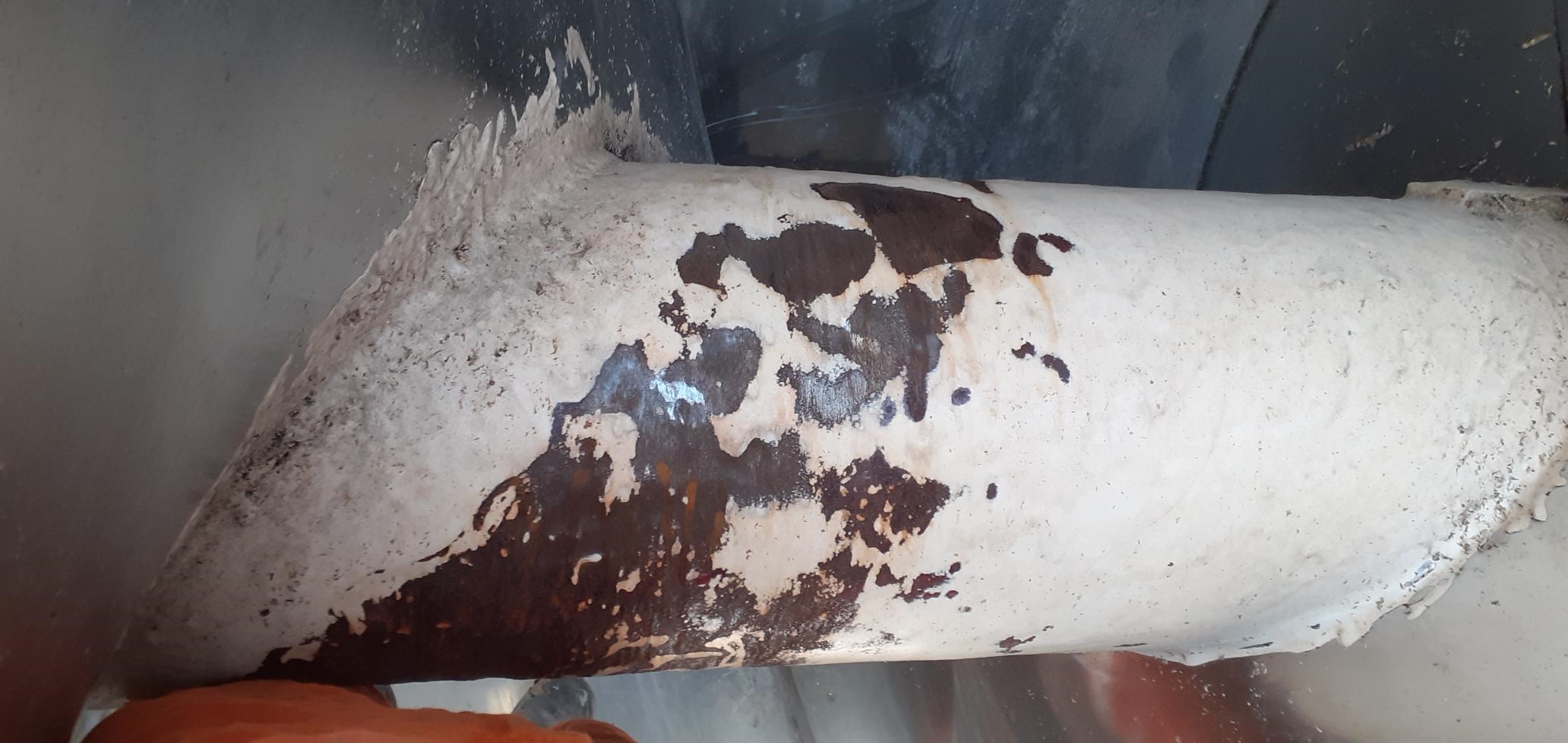 wet pulp screw conveyor with localised areas of erosion and scoring