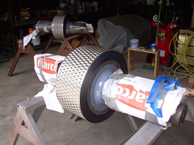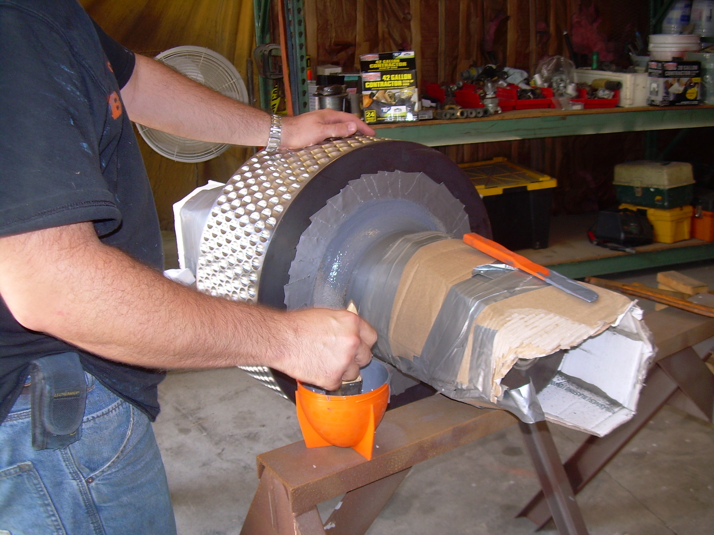 We’ve done at least two or three sets of these units and they get the same treatment. First, the area is masked off with duct tape and all other surfaces especially, the machined surface, are protected against grit blasting and/or accidental contact. The area to be coated is grit blasted with Black Beauty Coal Slag and coated with one coat of Belzona® 1391T