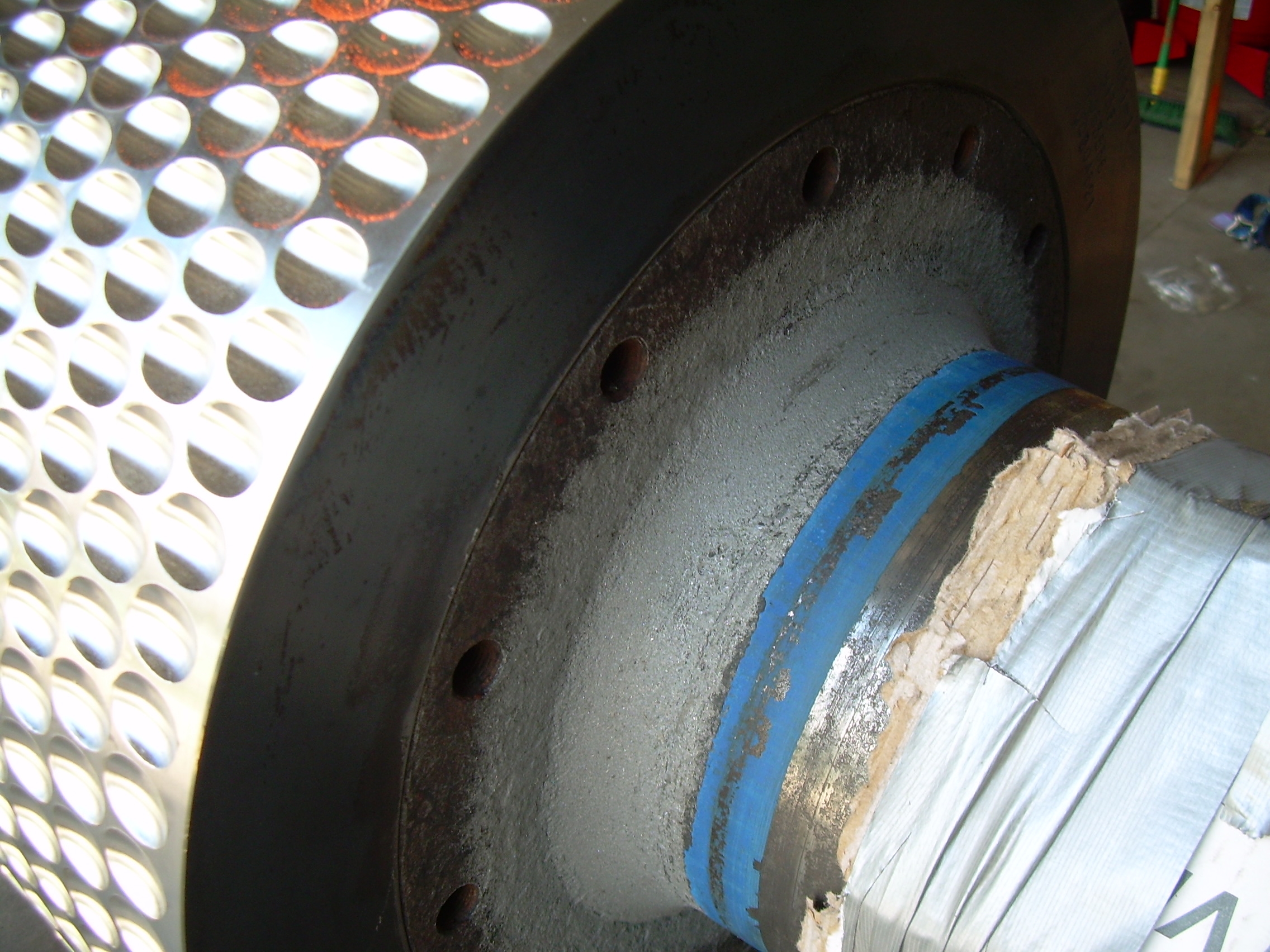 First, the area is masked off with duct tape especially the machined surfaces are protected against grit blasting and/or accidental contact. The area to be coated is grit blasted with Black Beauty Coal Slag and coated with one coat of Belzona® 1391HT