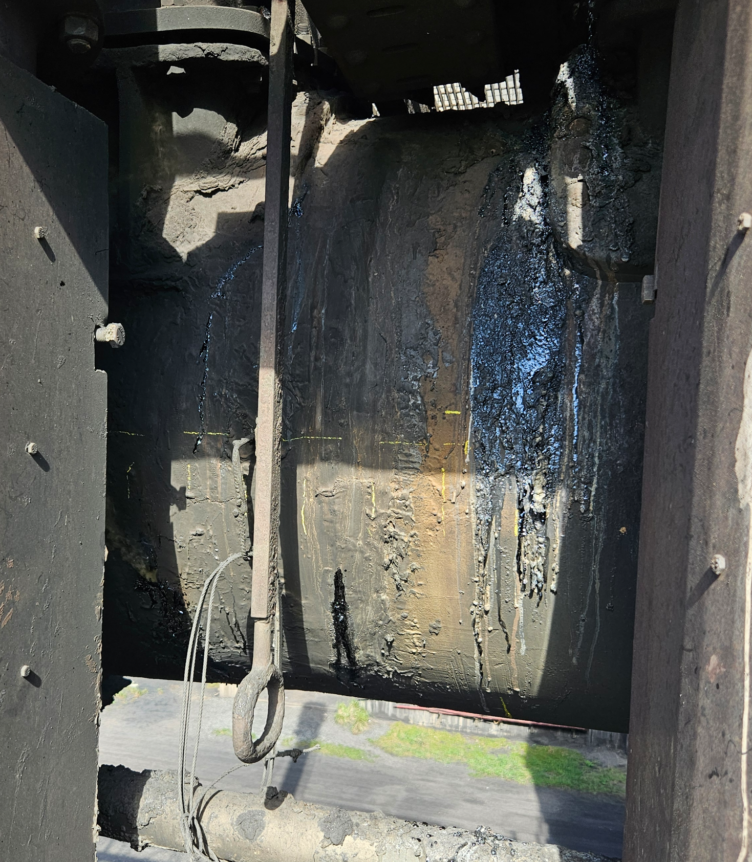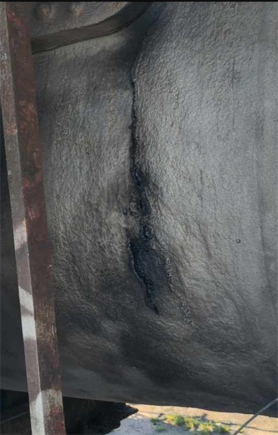 Here we have the area with the crack, tar has leaked out and at the moment the pressure is reduced so no smoke is leaking out