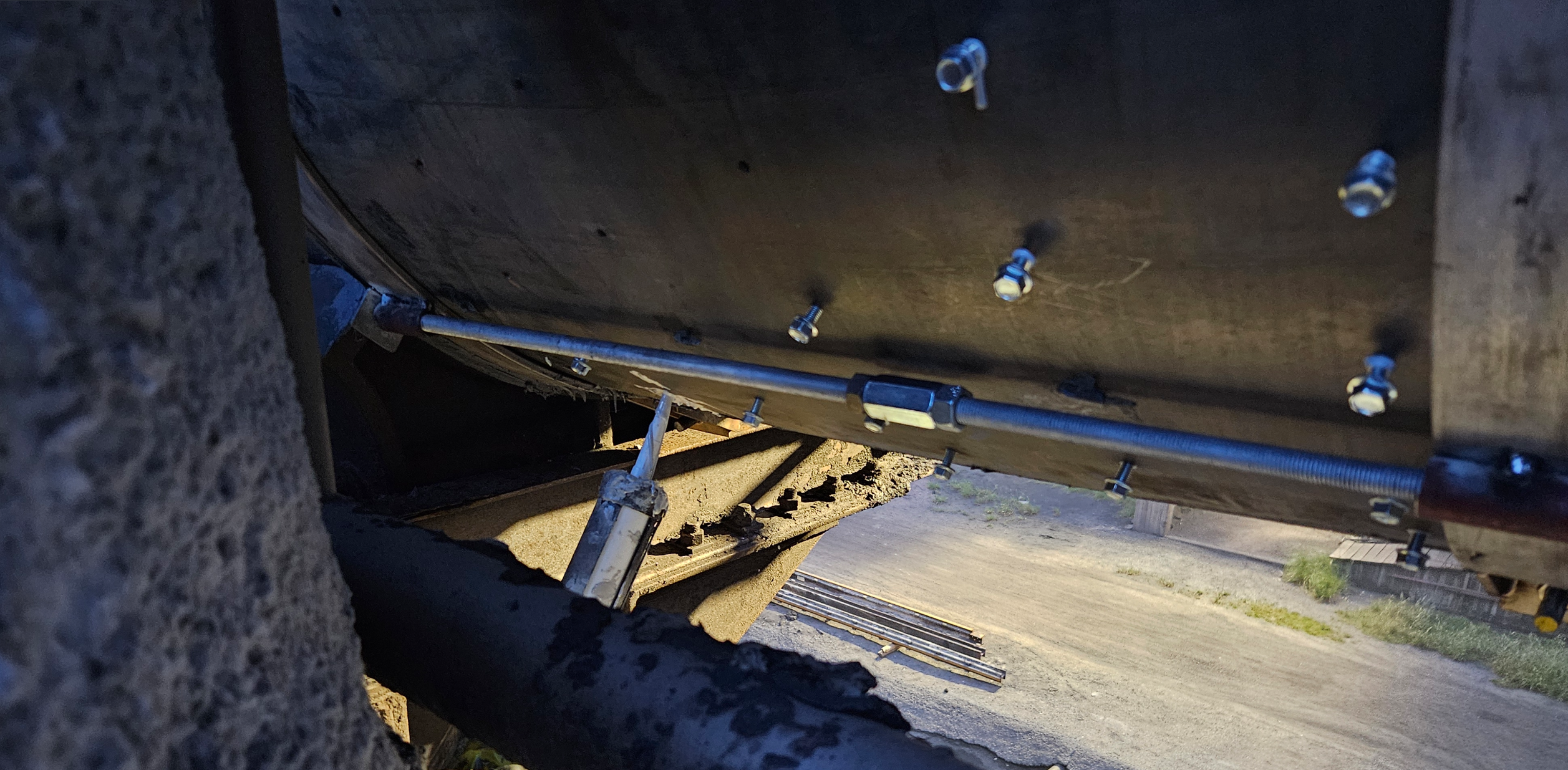 Injecting with Belzona 1391T to fill the space between the sheet and the pipe. We started at the bottom and worked our way up. This way we both bond and seal the whole system.