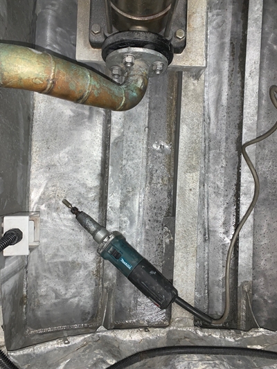 Due to the confined space of the repair area, hand held power tools were required to carry out the surface preparation. Once complete, 2 coats of Belzona 5811 was applied achieving a 500 micron film thickness.