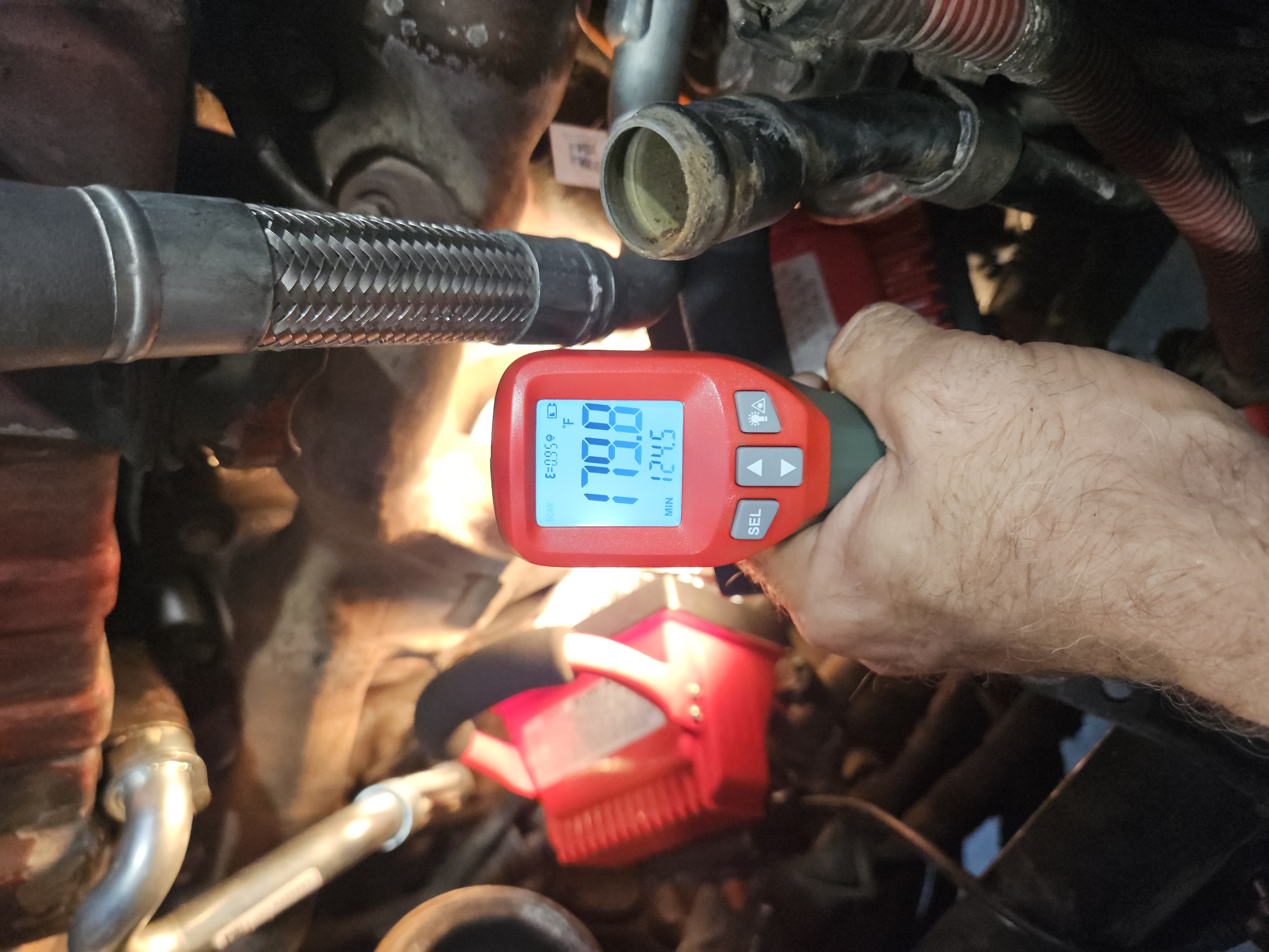 Infrared thermometer reading 179.8 °F during heat-curing process of the epoxy sealant on the engine block.