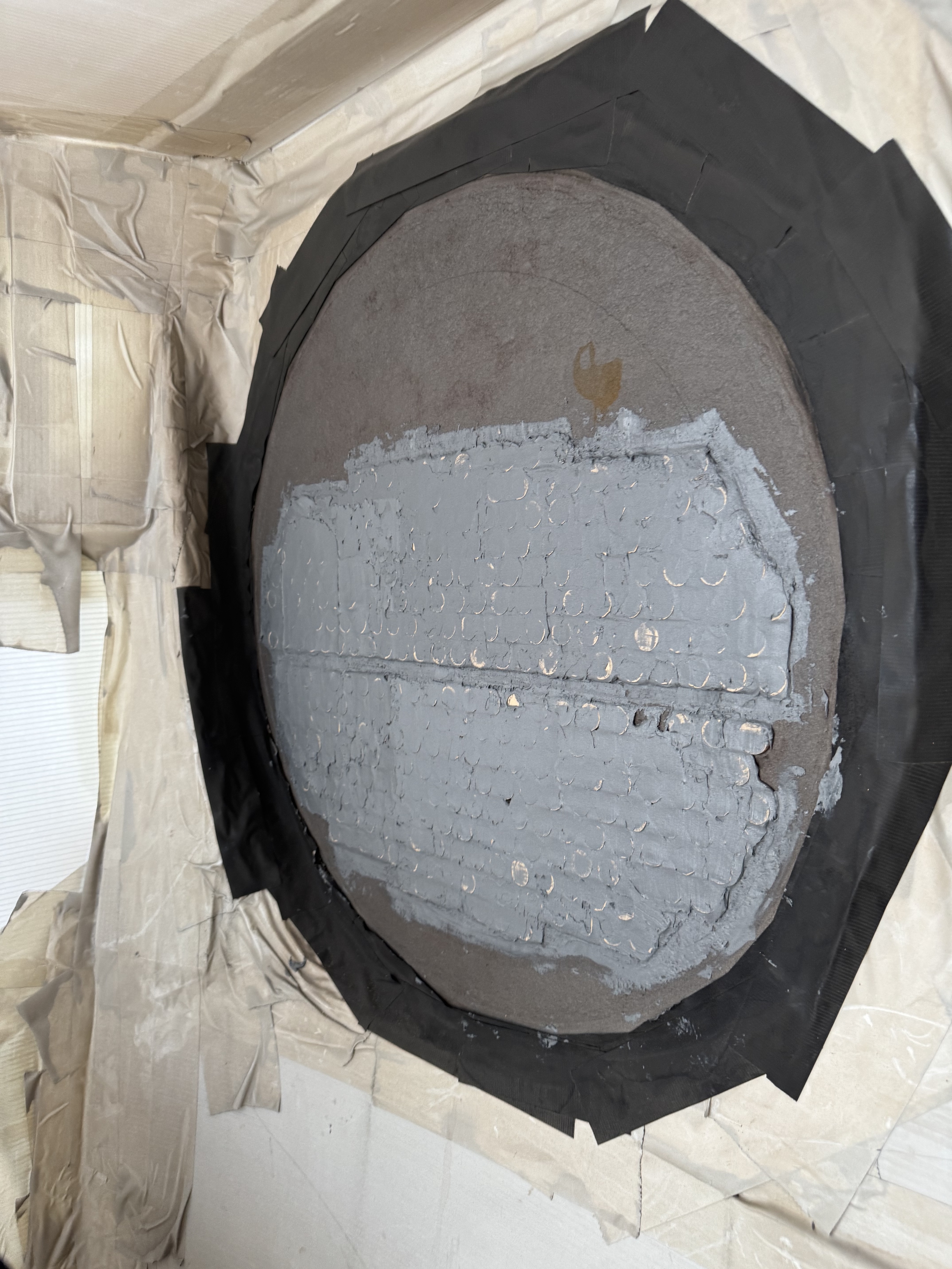 Surface after abrasive blasting, showing a clean and profiled tube sheet ready for application. Tubes protected using corks.