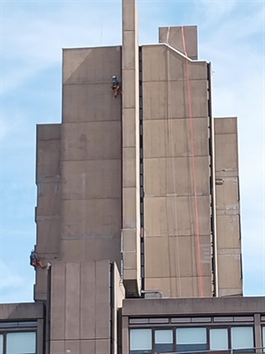General view of the West face of the building, showing IRATA L3 Rope access engineers carrying out repair works with Belzona 4911 and Belzona 4141