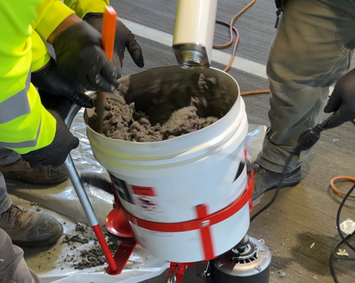 Belzona 4141 (Magma-Build) Base and Solidifier components were combined using a bucket mixer, mixing thoroughly for approximately 5 minutes until an even color and consistency were achieved. The mixer paddle was periodically withdrawn and scraped clean during the mixing process to ensure complete incorporation of both components.