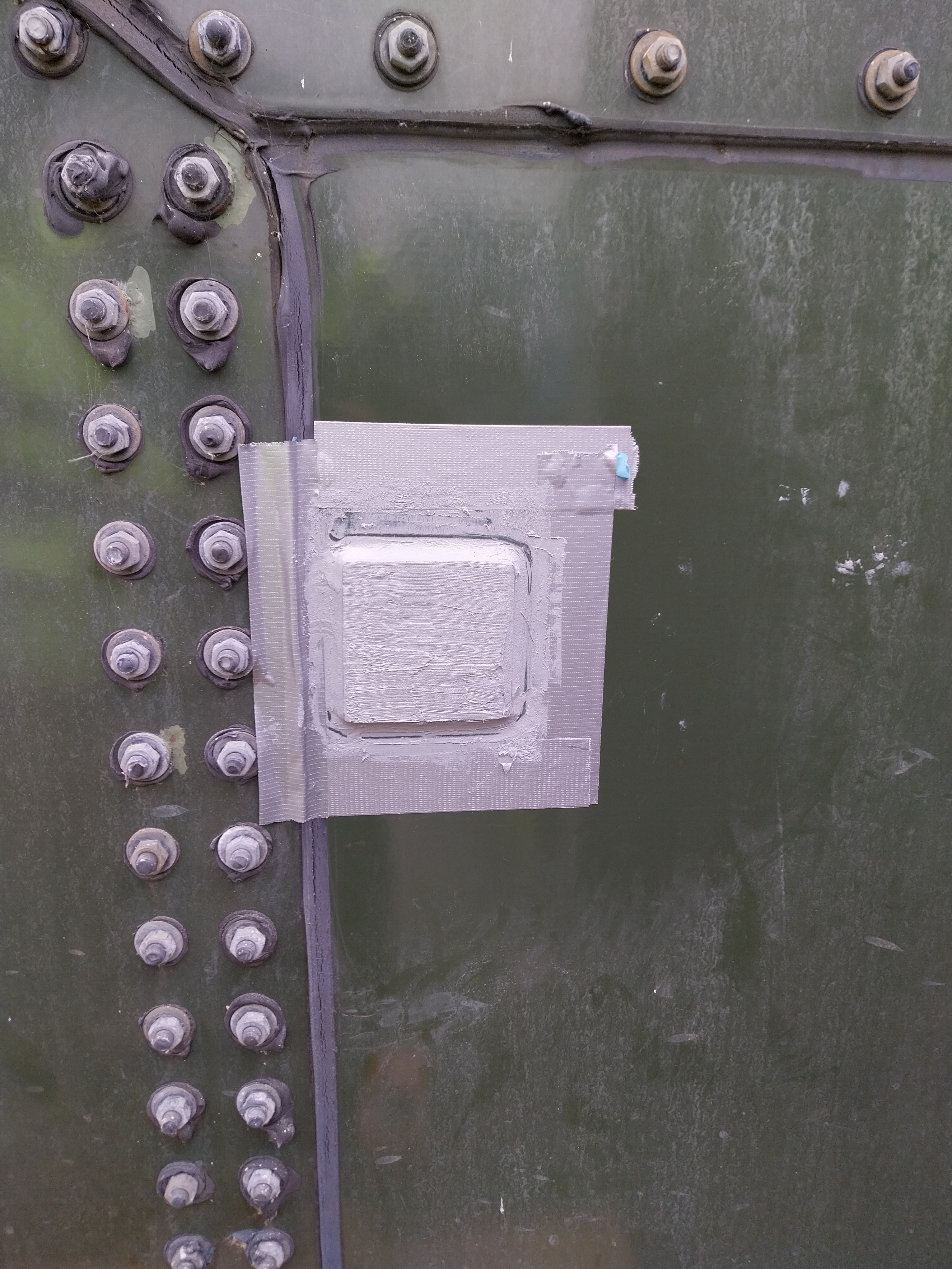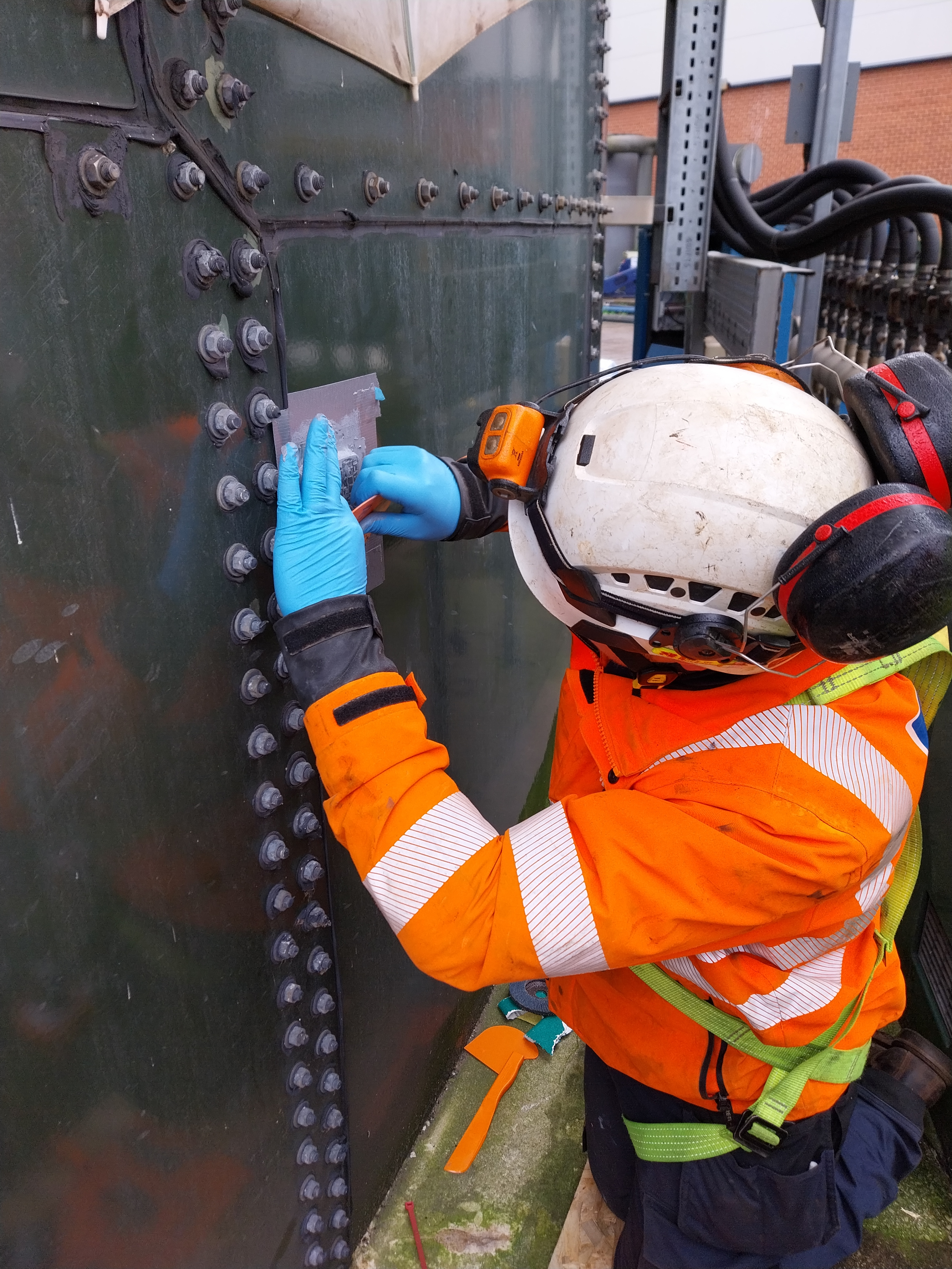 The surface of the tank was prepared with hand tools to minimum surface preparation. Using carbon fibre plates, the plates were bonded using Belzona 1111 to seal and ensure no further ingress of corrosion would affect the tank