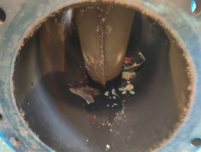 Corrosion and erosion damage on the lower pump casing.