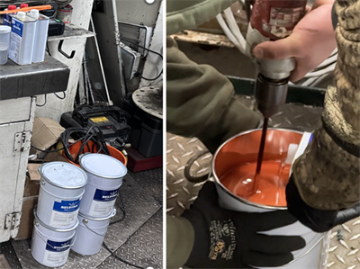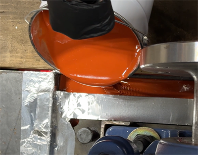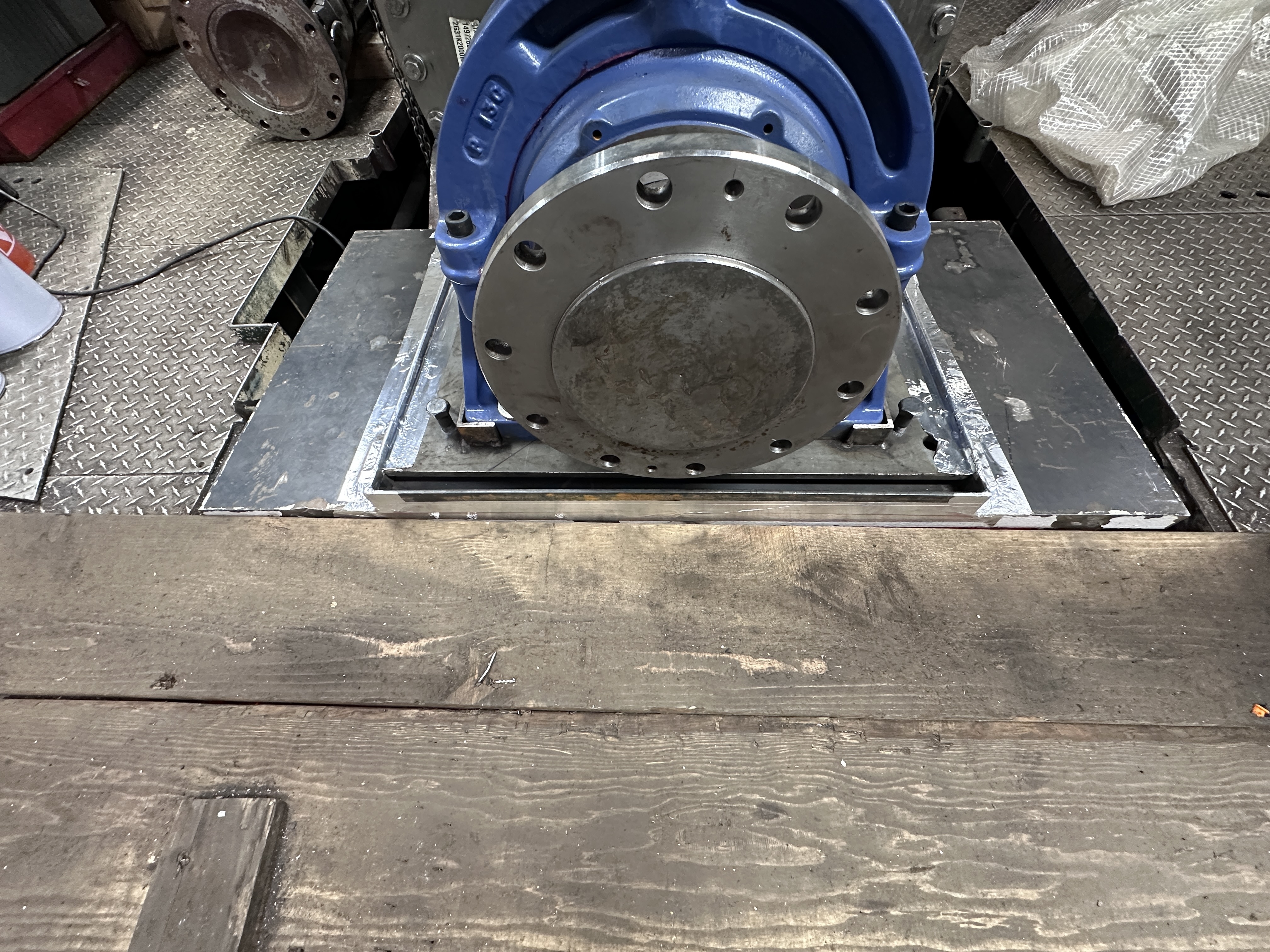 The carbon steel bearing seat surfaces were prepared using hand tools to remove all surface contaminants, mill scale, and oxidation, establishing a clean substrate suitable for bonding. A 1-inch gap was maintained between the bearing and the foundation to accommodate the Belzona 7111 pour. Dams were constructed around each bearing seat to contain the liquid chocking compound during the pour. Belzona 7111 was mixed and poured in accordance with Belzona's Instructions for Use (IFUs). Four units of material were used per pour, and the installation required four separate pours to complete the full shaft bearing set. Each pour was allowed to cure for one day before proceeding. Release agent was applied to all non-bonding surfaces to ensure clean separation where required.