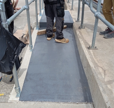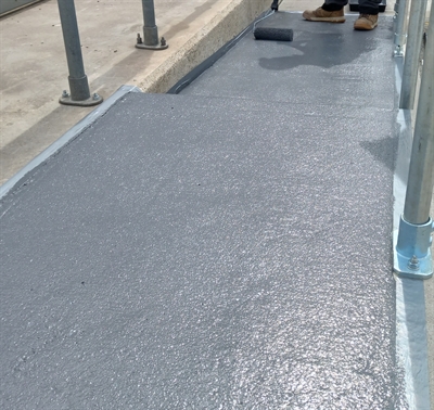 The Belzona 5231 was mixed and the first coat applied, after which around 2Kg per m2 of Belzona 9221 Surefoot aggregate was scattered into the wet surface.
