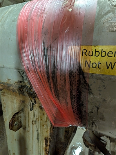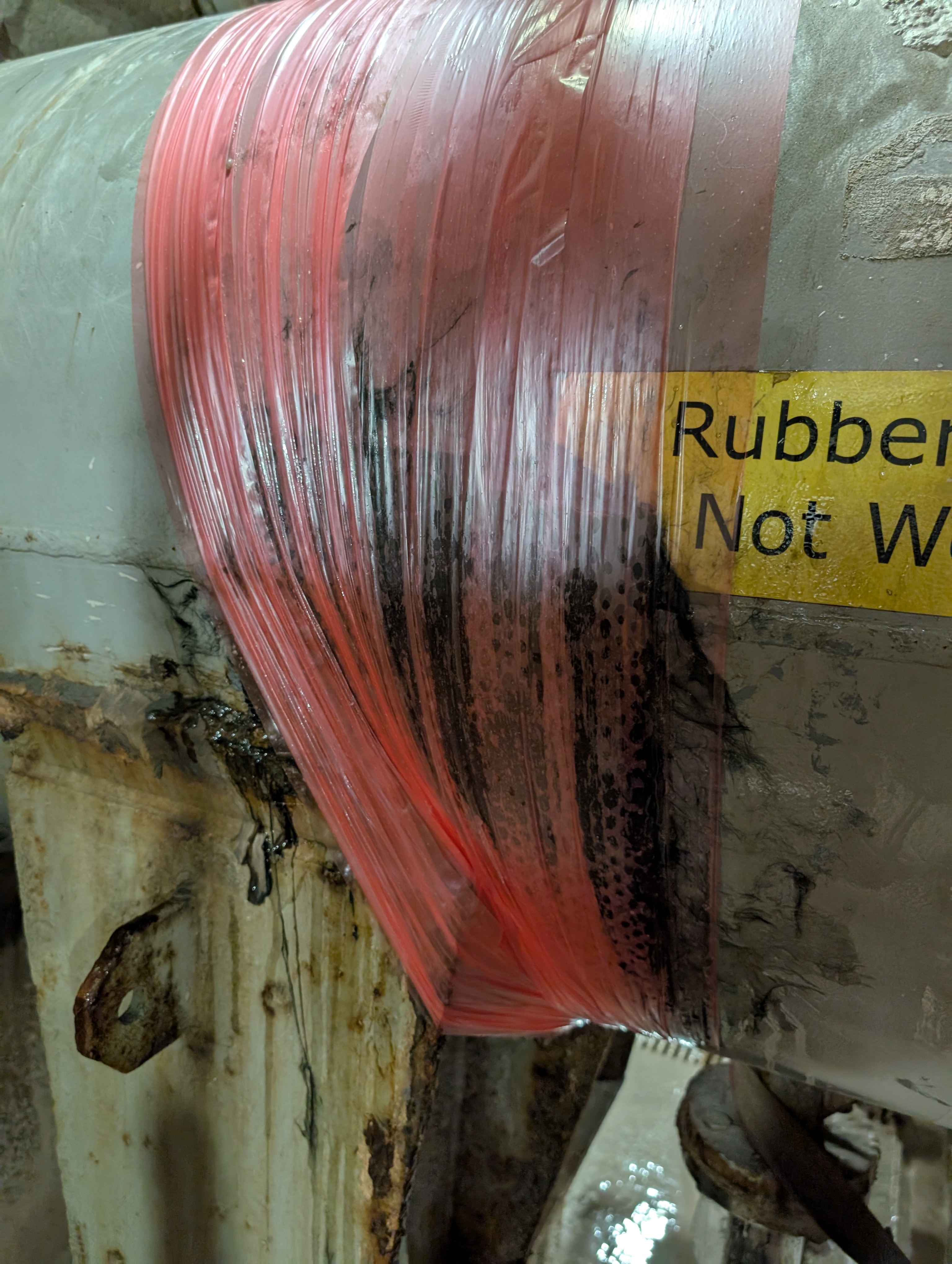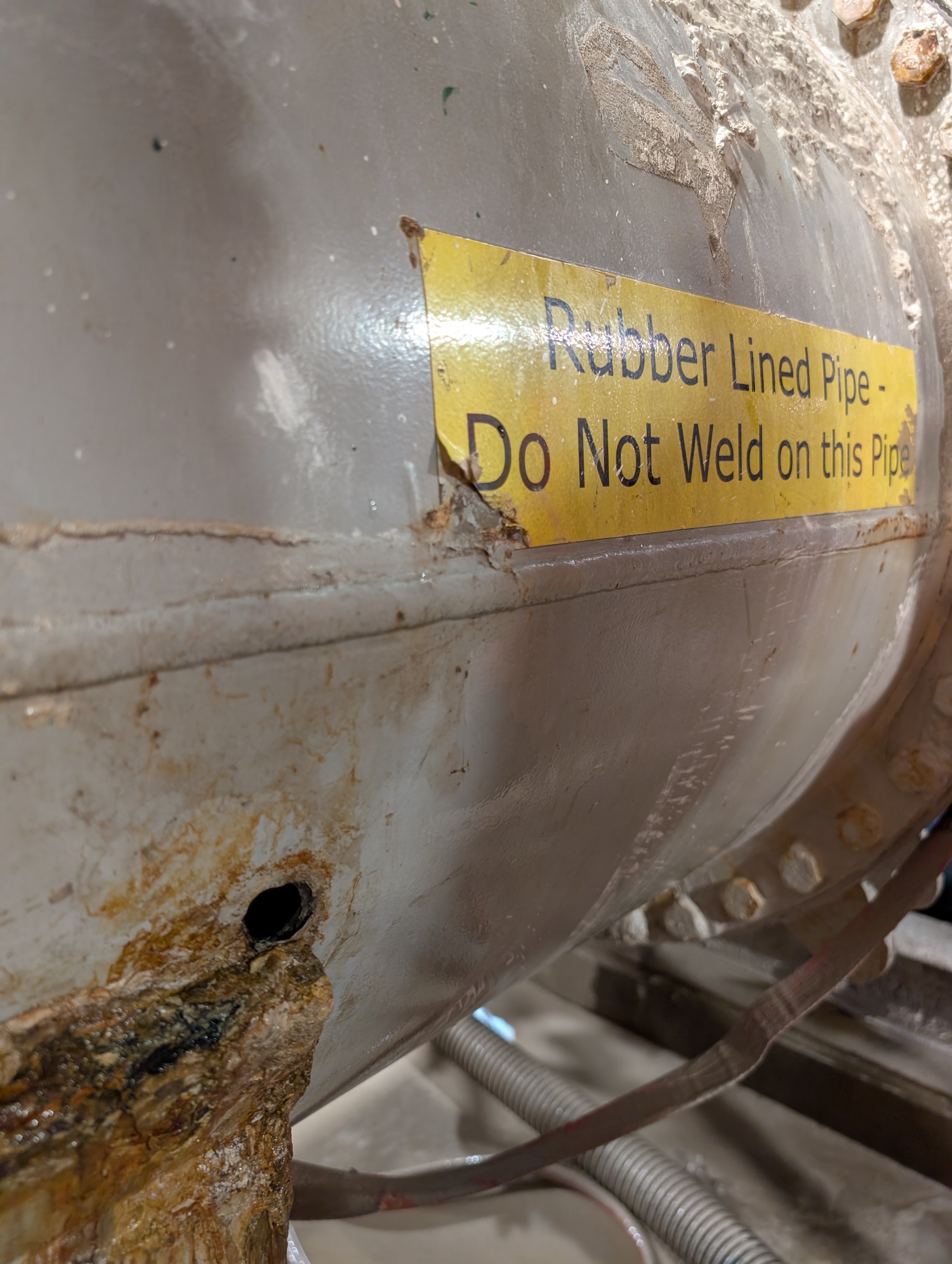 Problem: A rubber-lined slurry pipe inside a cement plant has developed an approx 1-inch diameter hole that has penetrated through the wall, resulting in an active leak of abrasive slurry.