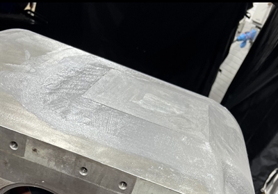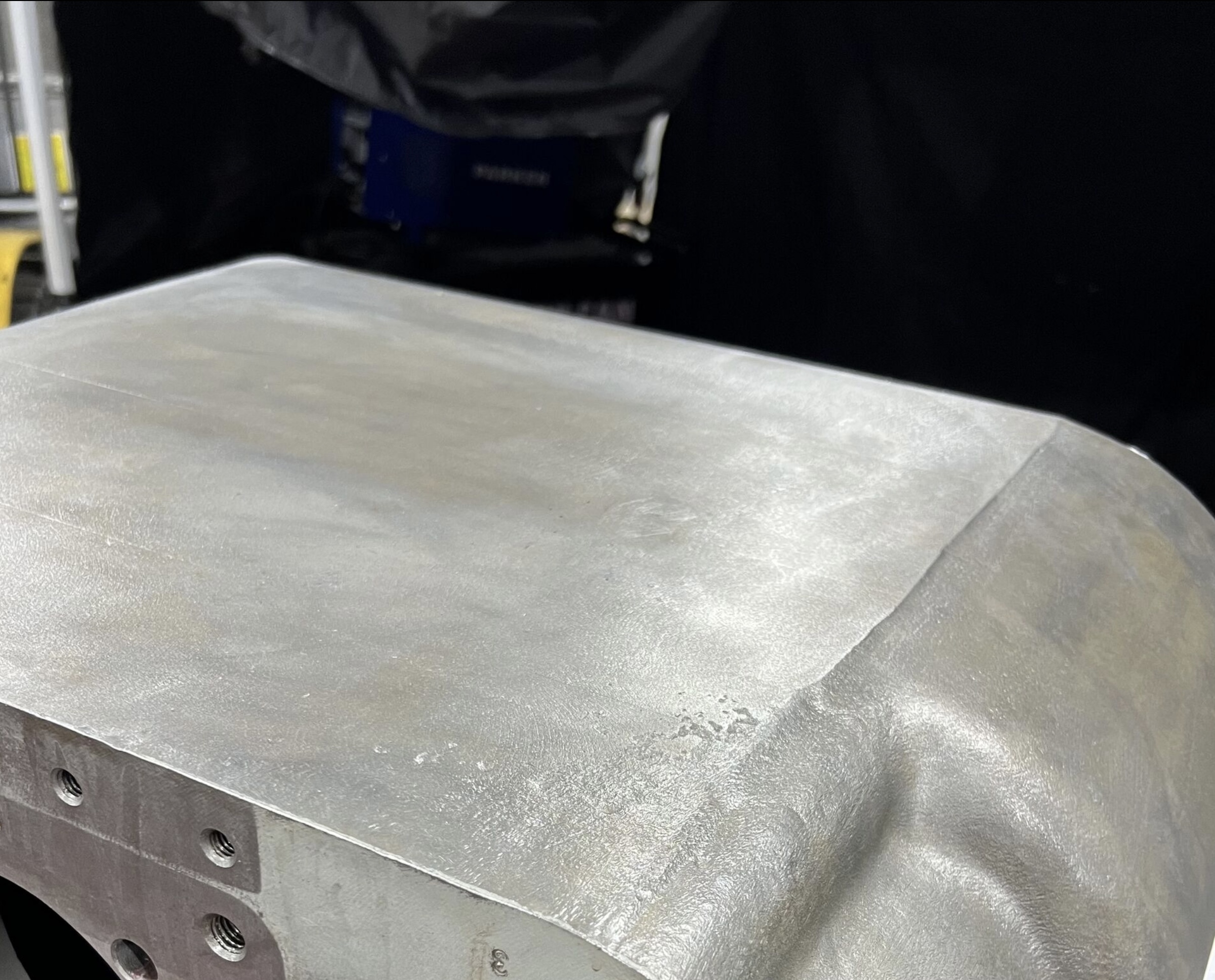 IN THIS PHOTO WE PREPPED THE SURFACE AREA USING MEK TO REMOVE ANY OILS FOLLOWED BY HEATING THE SURFACE AREA TO REMOVE ANY OILS THAT HAD BEEN ABSORBED IN THE METAL. FOLLOWED UP WITH A BRISTLE BLATER FOR A 3MIL PROFILE.