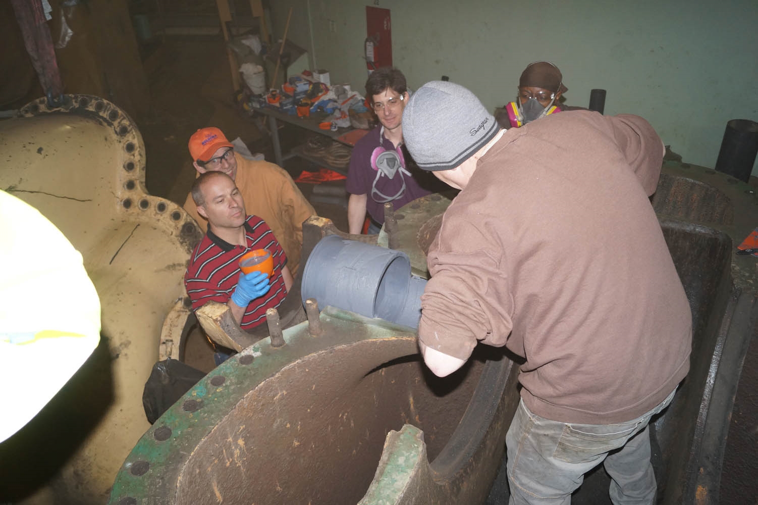 Lowering the upper casing into place to cast the Belzona. Since this is a 100% solids, no VOCs product whatever we cast to will be the final dimension.