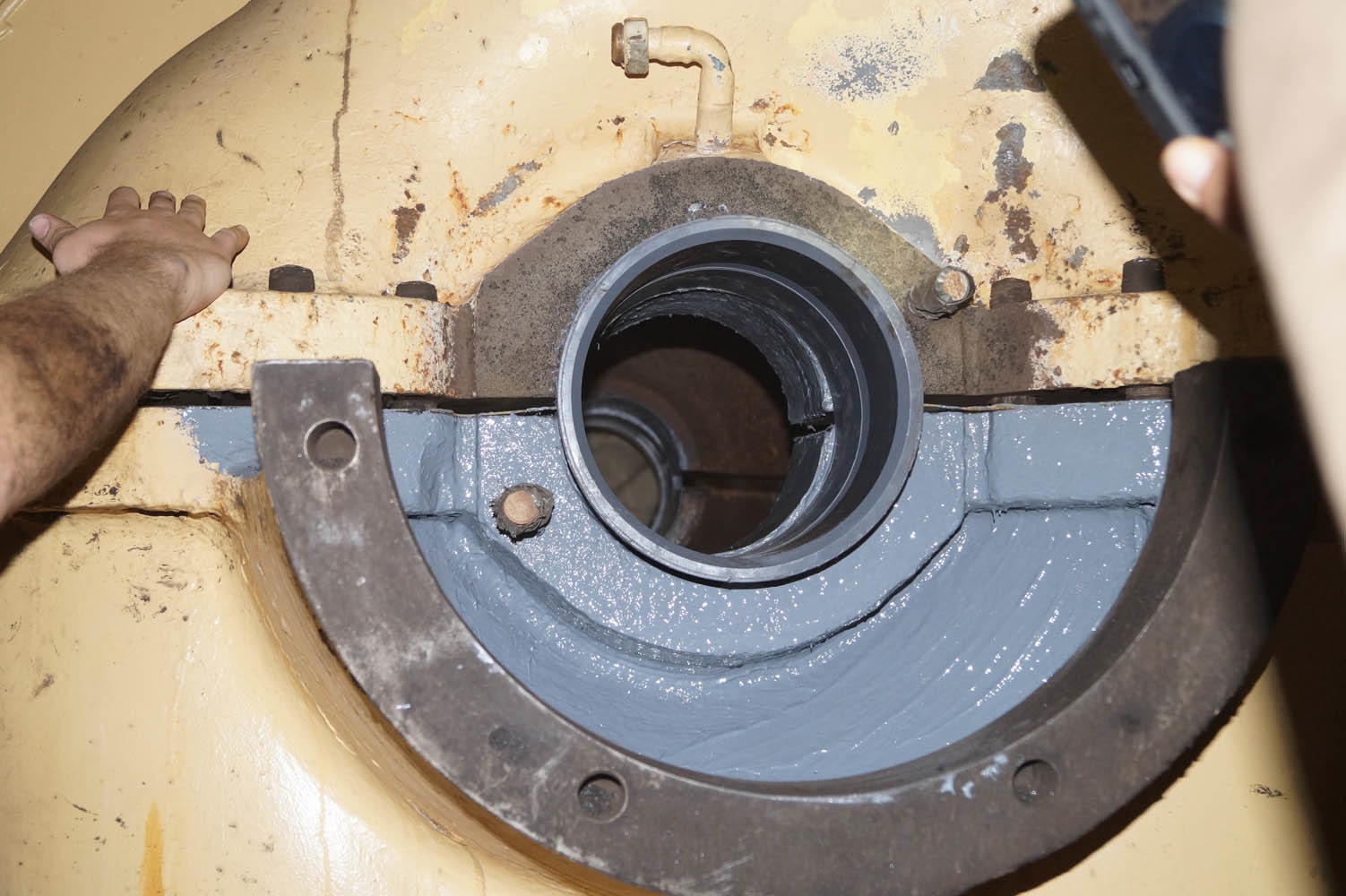 The area was grit blasted to SSPC SP 10 (near white finish). Belzona 1311 (Ceramic R-Metal) was mixed and applied to the packing gland housing using Belzona applicators and spatulas. After the new housing was set, the upper casing was lowered to the mating surface on the lower casing creating a perfect cast.