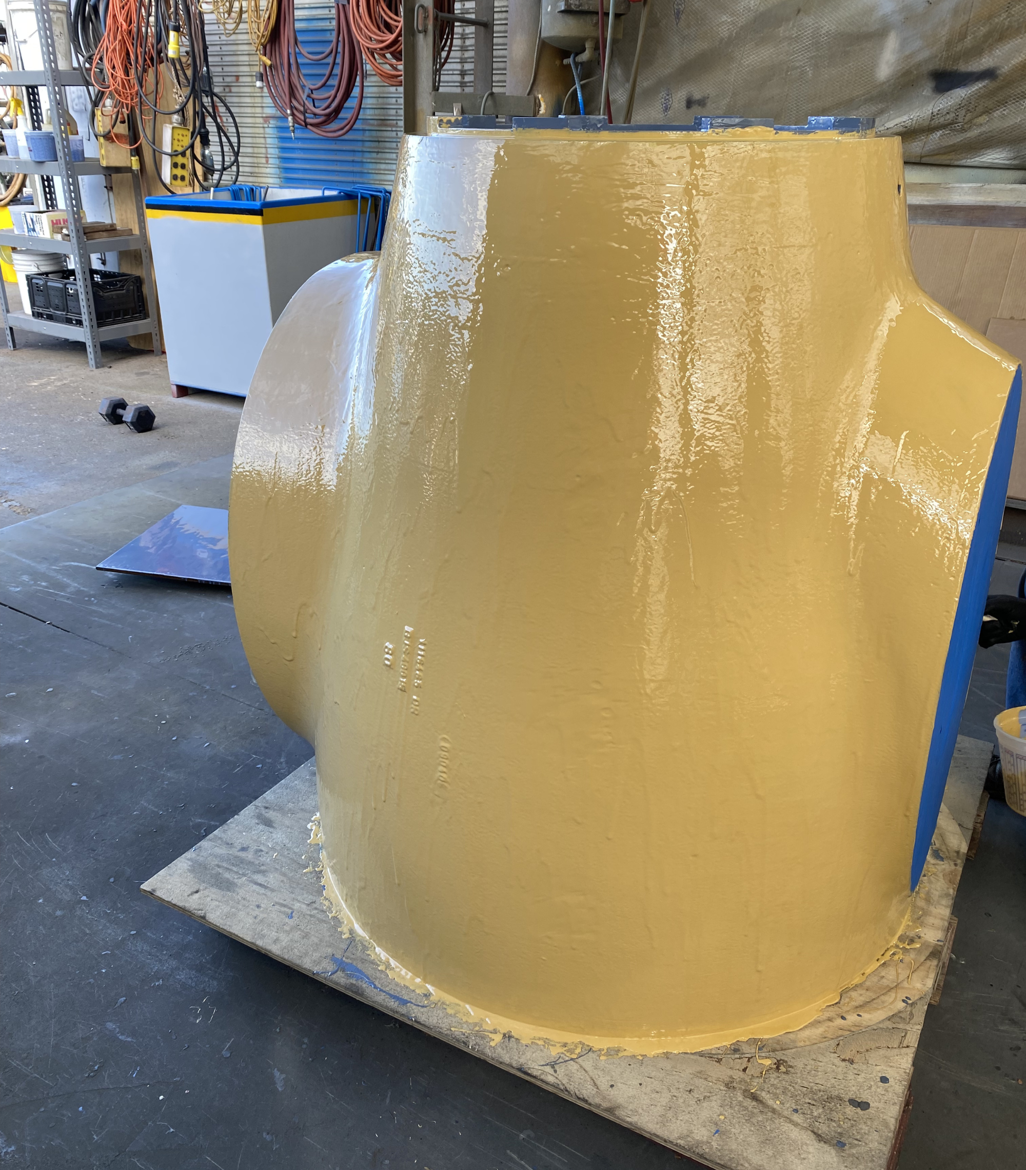 Problem: The azimuth nozzle on a Z-drive propulsion system was experiencing cavitation erosion caused by the high-velocity turbulence generated by the propeller during normal operation. The carbon steel nozzle surfaces showed significant material loss across approximately 20 square feet of affected area, with pitting and surface irregularities characteristic of sustained cavitation damage in a seawater immersion environment. The combination of cavitation forces and the corrosive effects of saltwater service accelerated the rate of deterioration. If left unaddressed, continued material loss would compromise the hydrodynamic profile of the nozzle, reducing propulsive efficiency and eventually threatening the structural integrity of the assembly. A durable repair and long-term protective coating solution was required to restore the nozzle geometry and prevent recurrence.